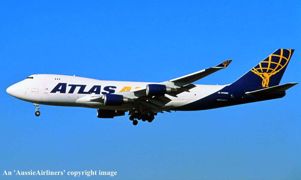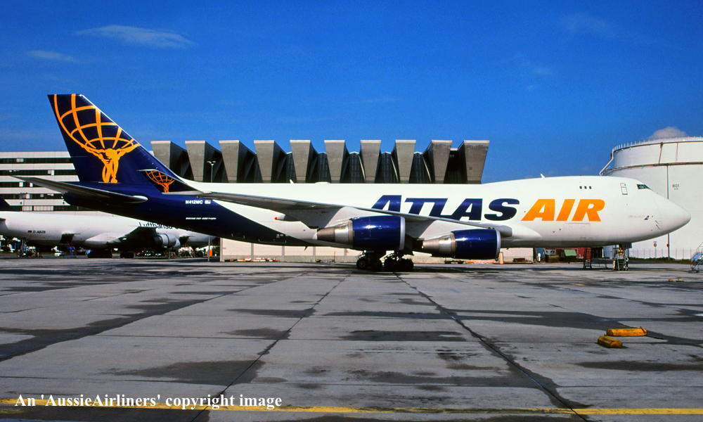 This aircraft was ordered new by Atlas Air - ? Built by the Boeing Company Limited, Everett - 2000 Rolled out at Everett (Paine Field) - March 2000 First flown as 'N412MC' - April 06, 2000 Powered by General Electric CF6-80C2B5F engines Entered onto the United States Aircraft Register as N412MC - April 25, 2000 Registered to First Security Bank, Salt Lake City, Utah Leased to Atlas Air Inc, Westchester, New York as the registered operator Registered to Wells Fargo Bank Nortrhwest NA - September 29, 2000 Leased to Atlas Air Inc as the registered operator It was observed at Osaka with 'China Southern Airlines' titles - February 24, 2001 It was observed at Osaka with 'China Southern Airlines' titles - October 03, 2002 It was observed at Homg Kong in the basic Atlas Air livery without titles - October 17, 2003 It was observed at Amsterdam (Schiphol) with 'Operated For British Airways' titles - March 31, 2004 It was observed at Frankfurt in the Atlas Air livery - May 29, 2005 Qantas Airways entered into a contract with Atlas Air to provide two Boeing 747-47UF frieght aircraft as needed - ? This aircraft was one of seven aircraft in the pool that was used for Qantas Freight operations The aircraft had 'Operated by Atlas Air on Behalf of Qantas Airways Ltd' decals applied to the nose It was observed at Sydney (Kingsford Smith) with 'Operated for Qantas Airways' titles - May 17, 2007 It was observed at Sydney (Kingsford Smith) with 'Operated for Qantas Airways' titles - November 12, 2008 It was observed at Sydney (Kingsford Smith) with 'Operated for Qantas Airways' titles - April 06, 2009 It was observed at Ramstein A.F.B. (Frankfurt) with 'Operated for Qantas Airways' titles - June 24, 2012 It was observed at Hong Kong with 'Operated for Qantas Airways' titles - July 07, 2012 It was observed at Munich with 'Operated for Qantas Airways' titles - June 15, 2013 It was observed with 'Operated for THY Turkish Airlines' titles - November 04, 2017 This aircraft was replaced by a Boeing 747-8 series aircraft under the contract - August 25, 2019 Current status Atlas Air |