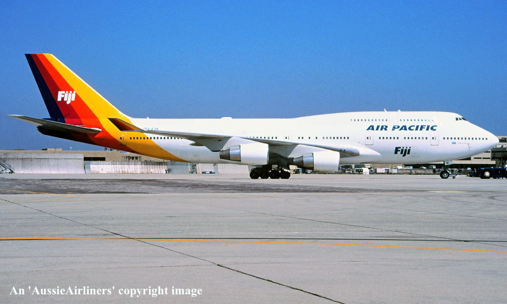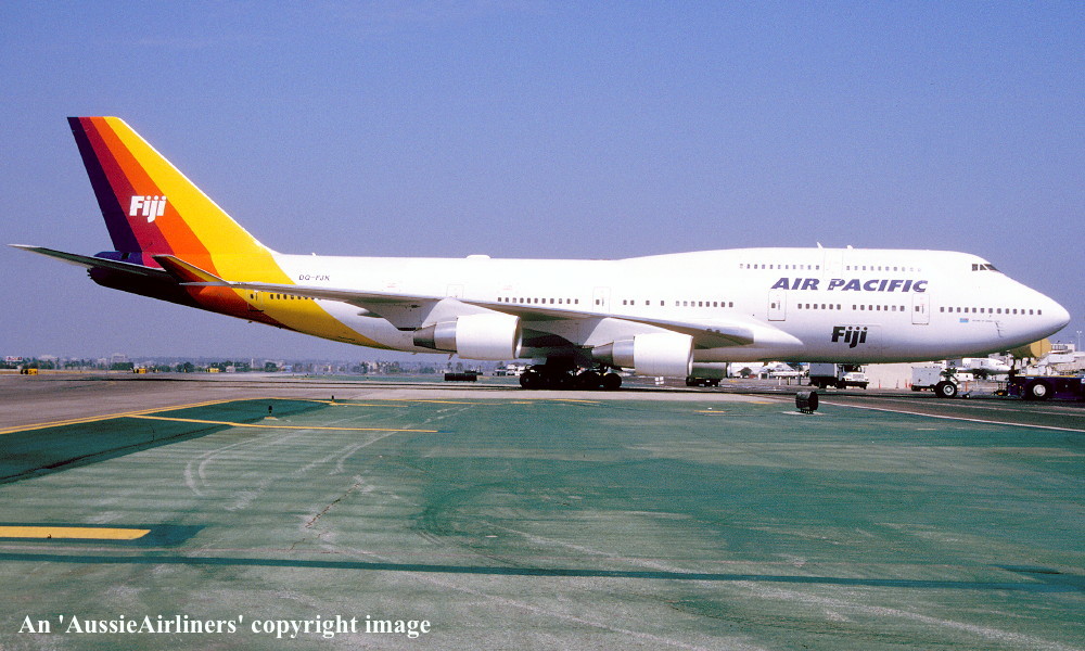 DQ-FJK. Air Pacific Fiji - 'Island of Vanua Levu' in the standard livery at Los Angeles Airport, July 2003. (R. N. Smith Collection Copyright Image 4631-337.) |