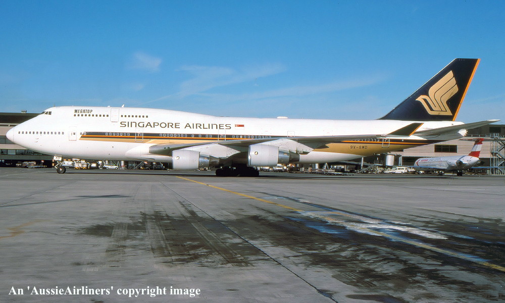 9V-SMD. Singapore Airlines - in the revised livery at with additional 'Megatop' titles an unknown airport, November 1996. (R. N. Smith Collection Copyright Image 4630-202.) |