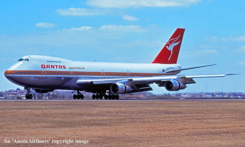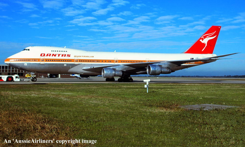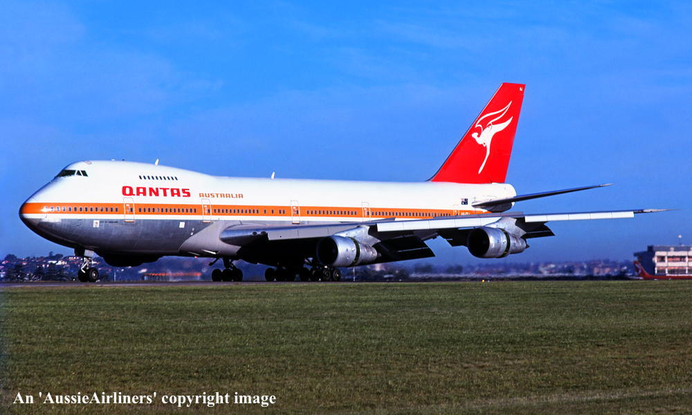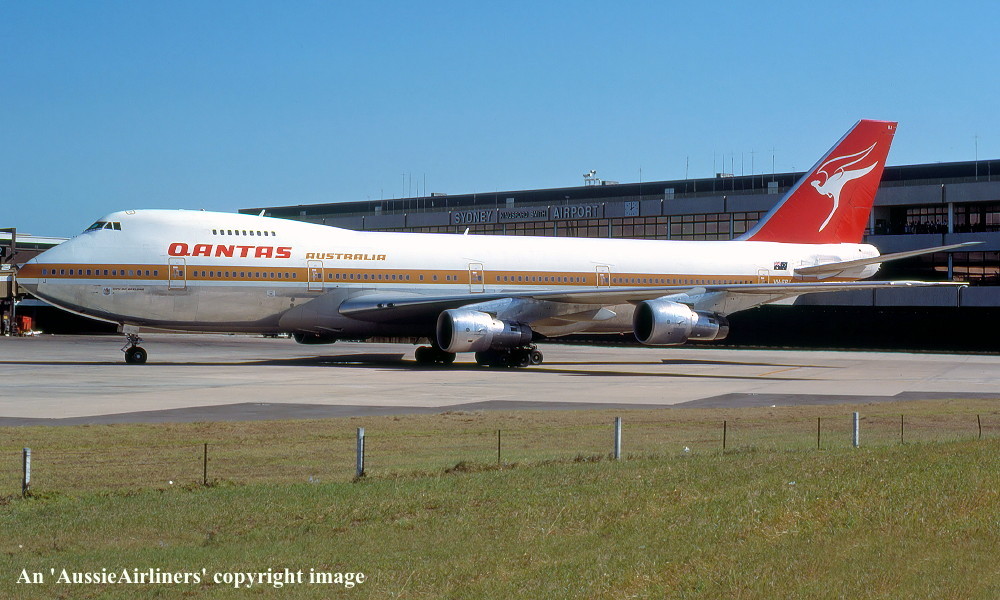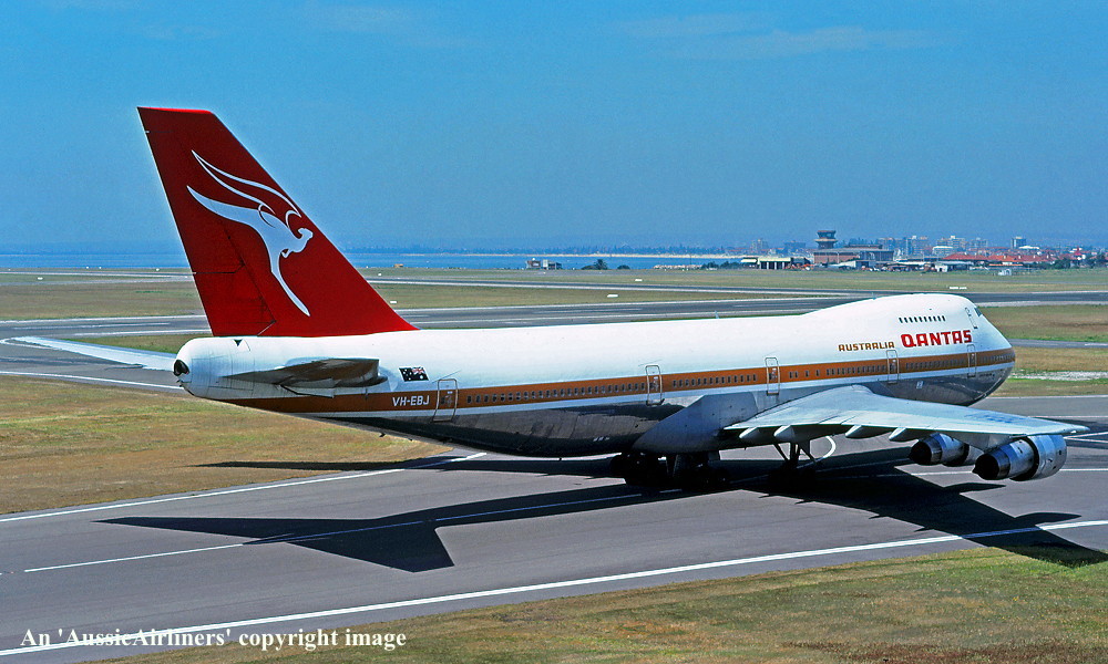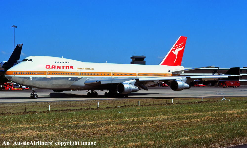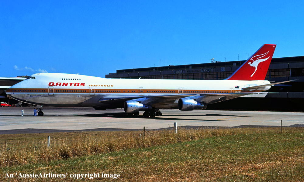 VH-EBJ. Qantas Australia - 'City of Geelong' in the 'ochre' livery at Sydney Kingsford Smith Airport, August 25, 1988. (R. N. Smith Copyright Image 4631-612.) |