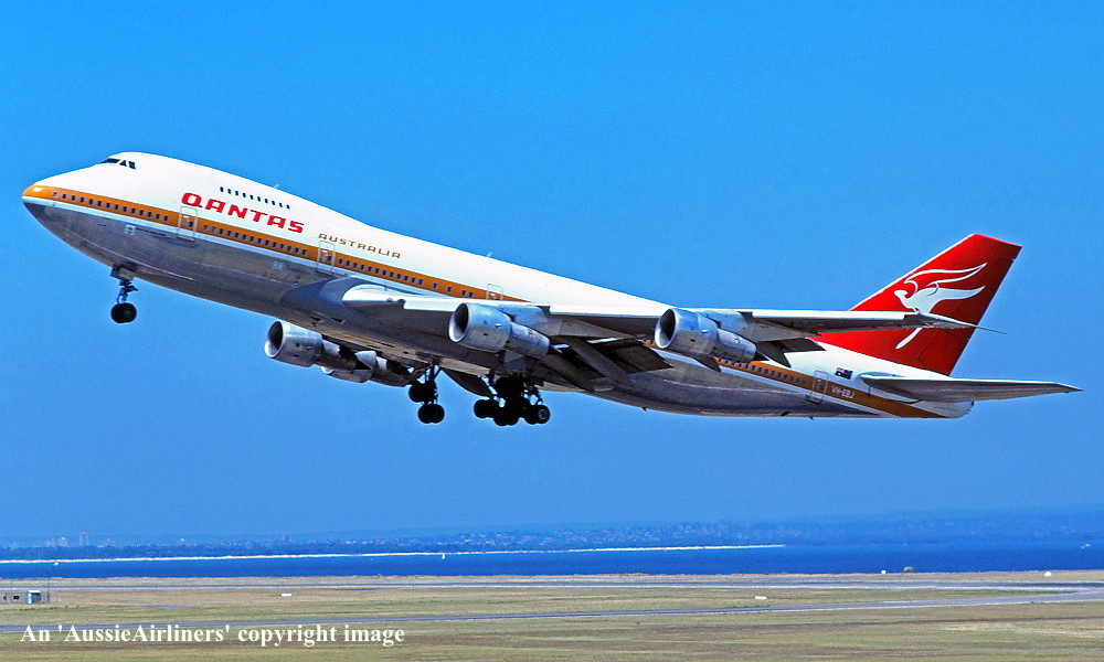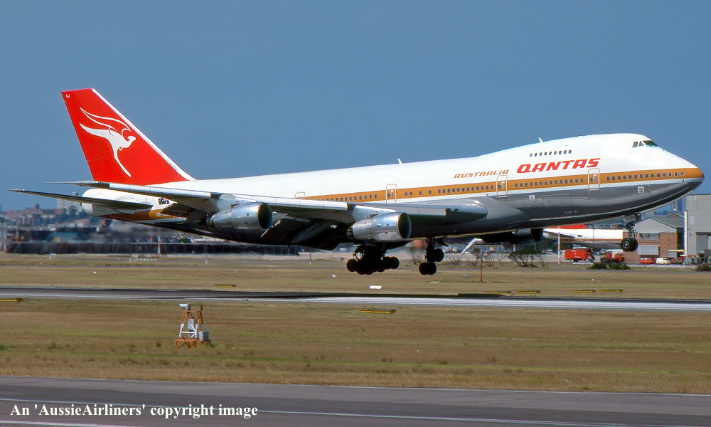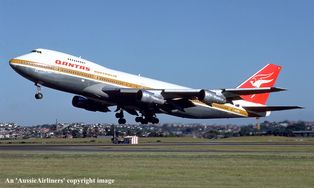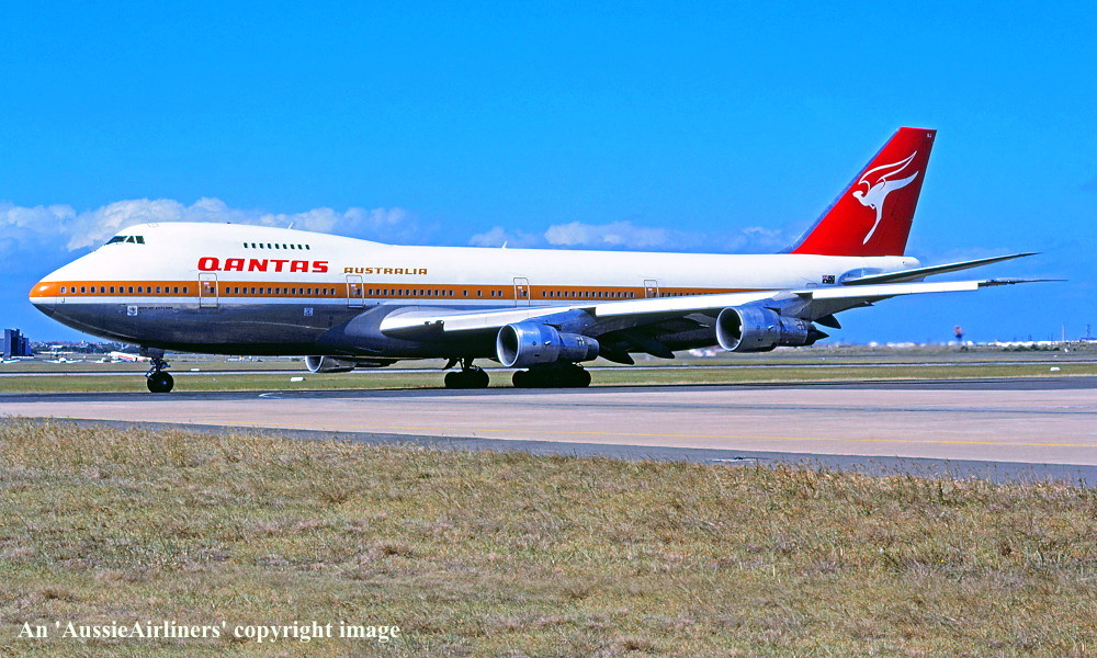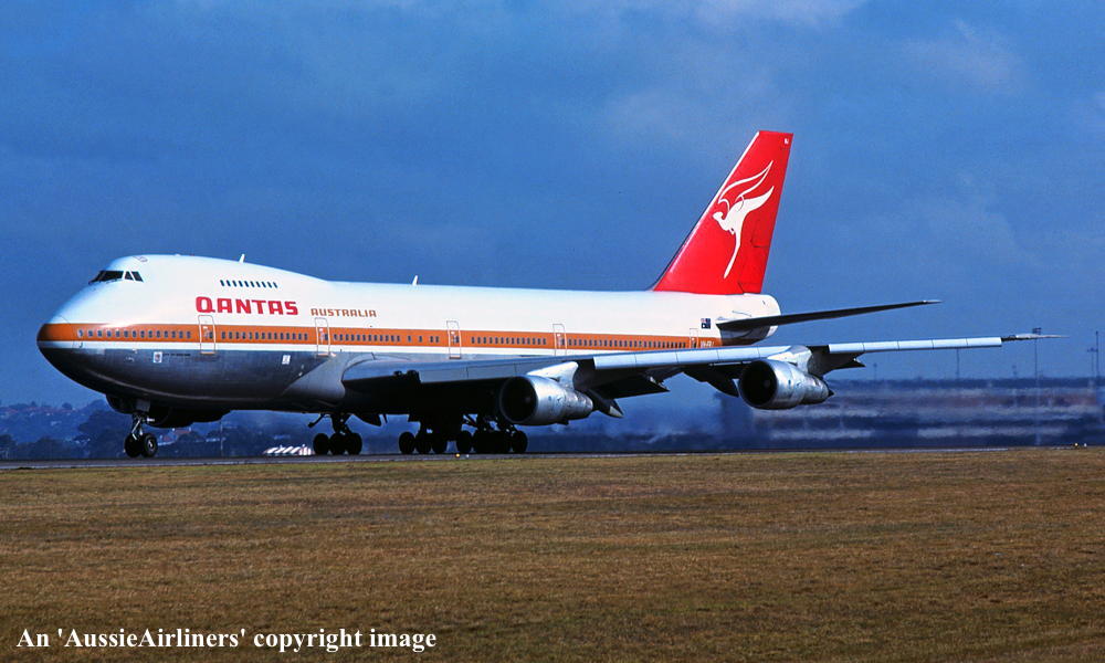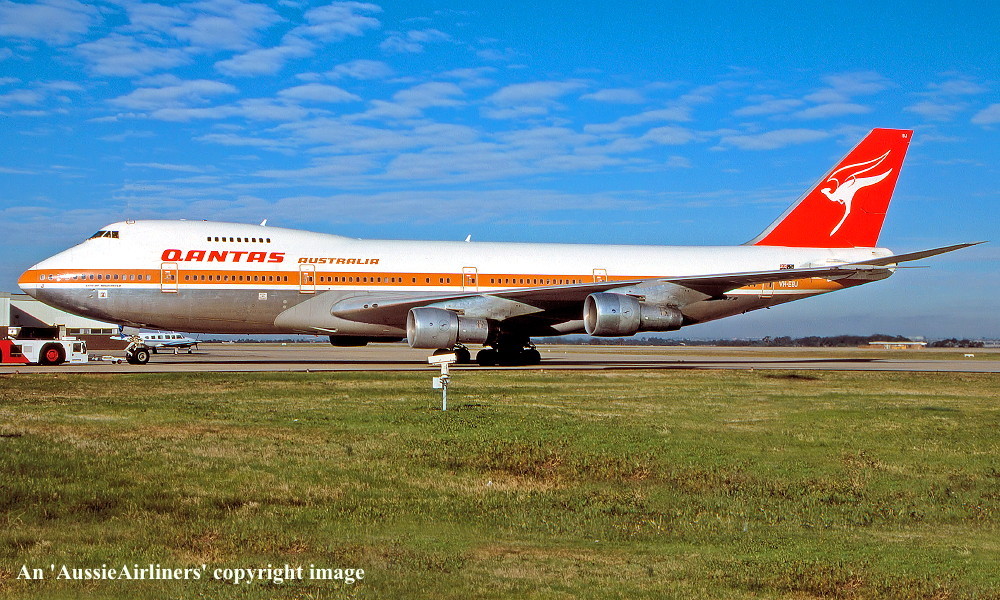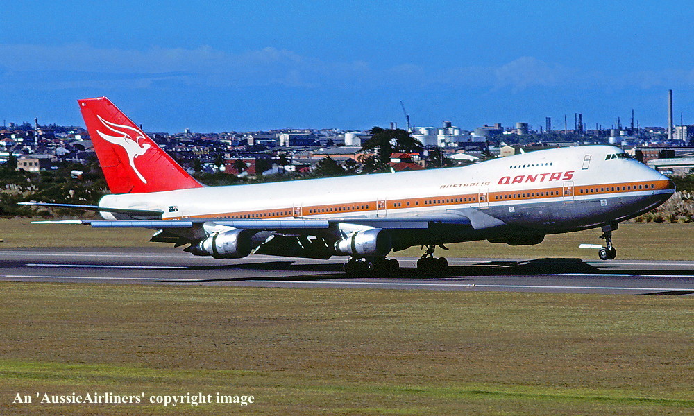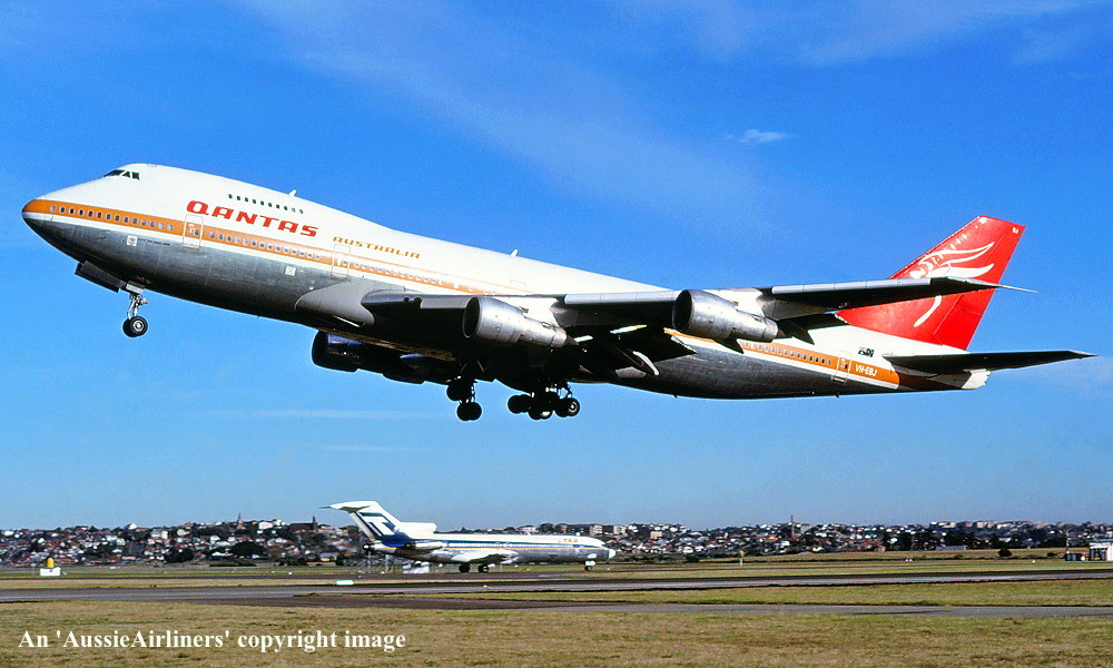 VH-EBJ. Qantas Australia - 'City of Geelong' in the 'ochre' livery at Sydney Kingsford Smith Airport, August 25, 1988. (R. N. Smith Copyright Image 4631-612.) |