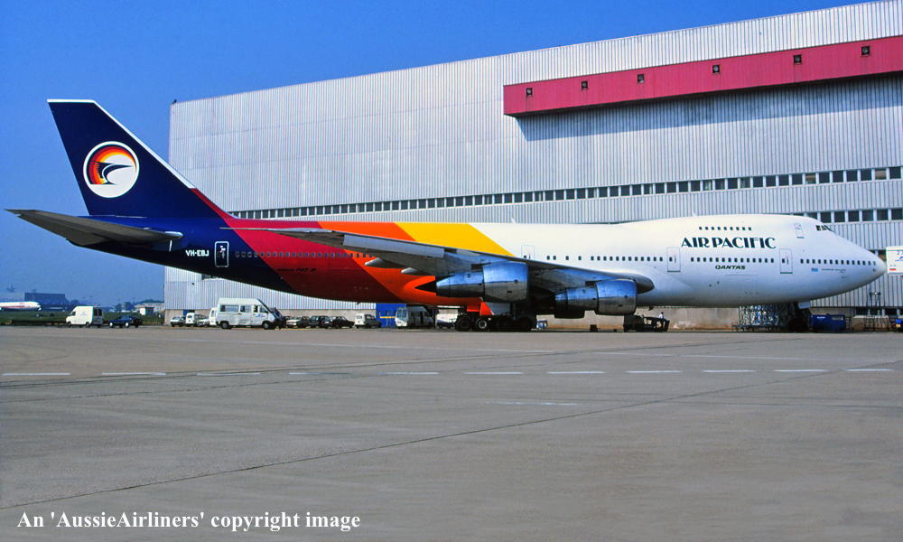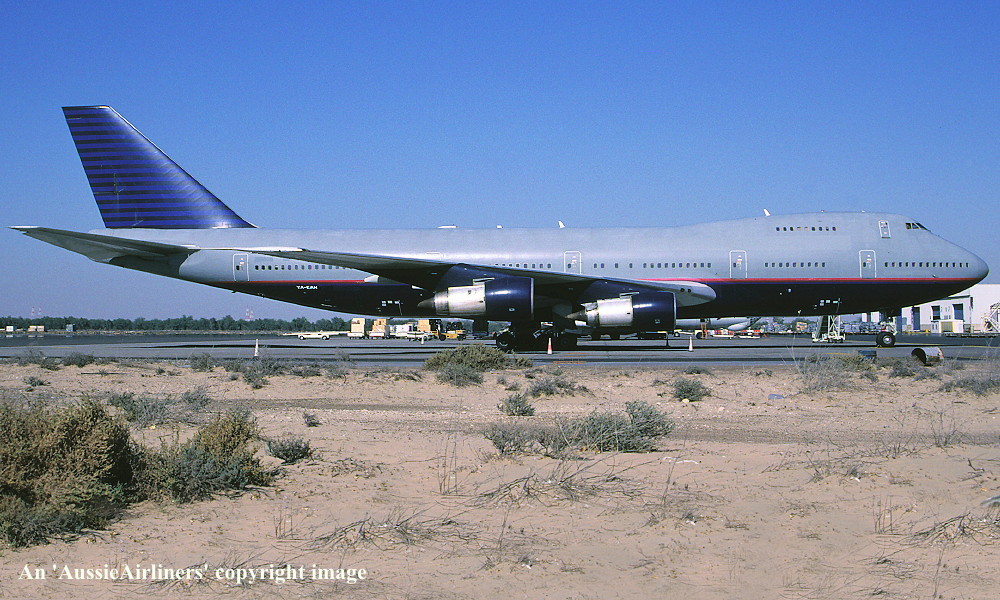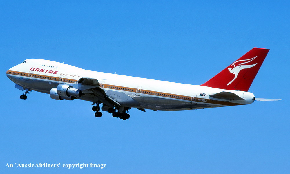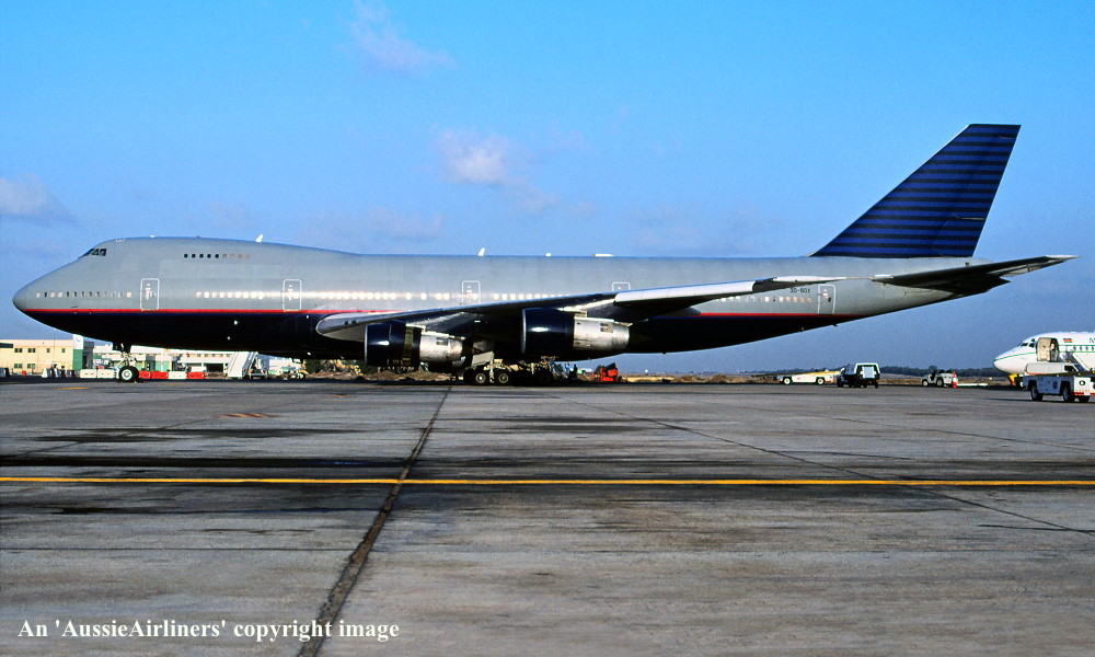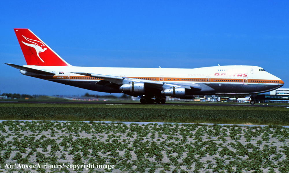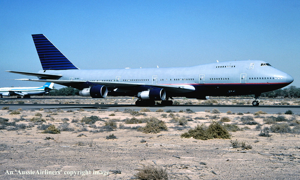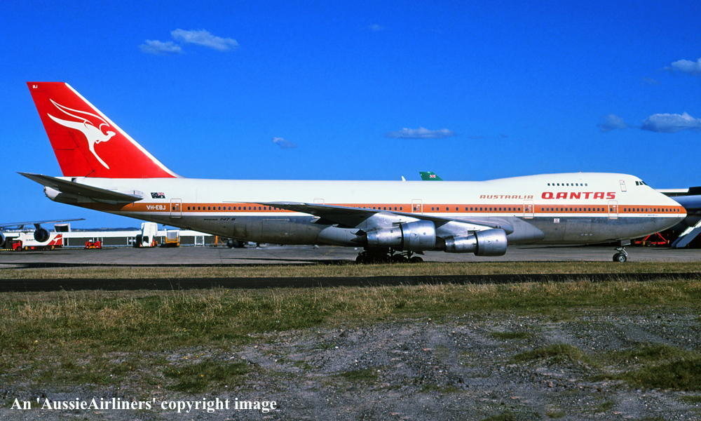 VH-EBJ. Boeing 747-238B. c/n 21054-260. Was also registered as: N158UA; YA-EAH; 3D-BOX; EK-74702; J2-KCD; XT-DMT. |