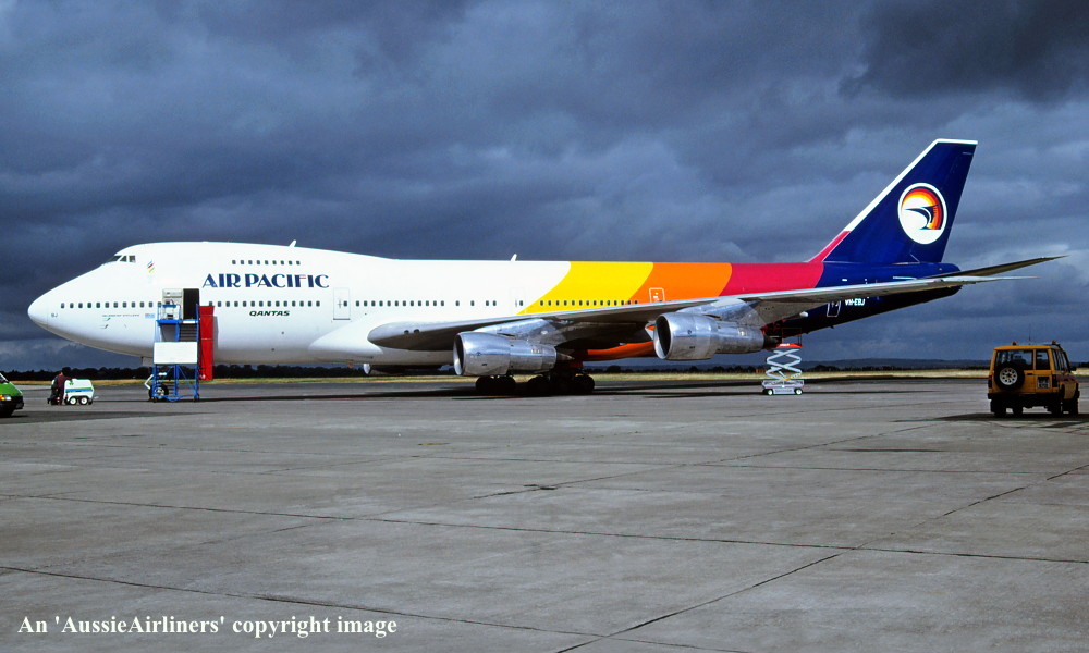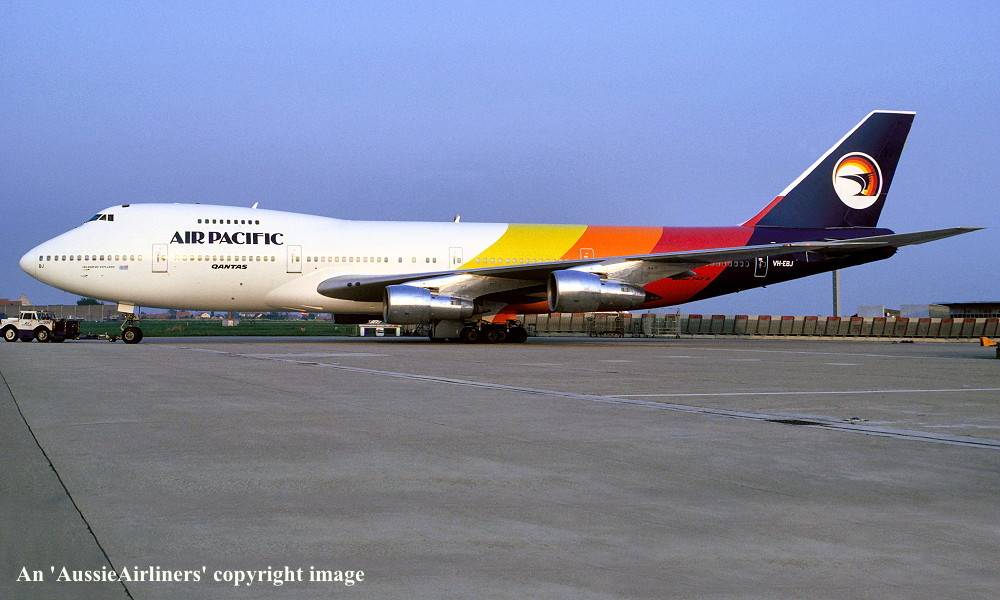 VH-EBJ. Air Pacific - 'Island of Viti Levu' in the standard livery with additional 'Qantas' titles at Paris Orly Airport, May 1989. (R. N. Smith Collection Copyright Image 4630-110.) |