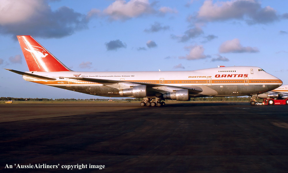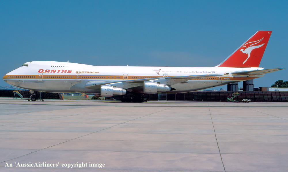 VH-EBJ. Qantas Australia - 'City of Geelong' in the 'ochre' livery with additional 'Official Carrier Commonwealth Games Brisbane 1982' titles at Brisbane Airport, January 1982. (R. N. Smith Collection Copyright Image 4630-572.) |