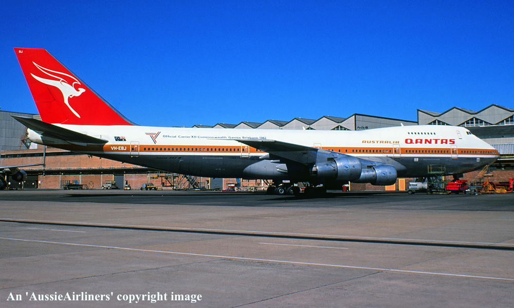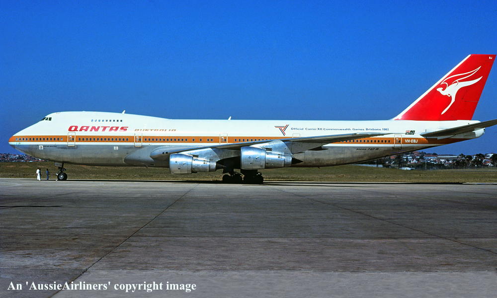 VH-EBJ. Qantas Australia - 'City of Geelong' in the 'ochre' livery with additional 'Official Carrier Commonwealth Games Brisbane 1982' titles at Sydney Kingsford Smith Airport, August 1981. (W. Spargo Copyright Image 4631-463.) |