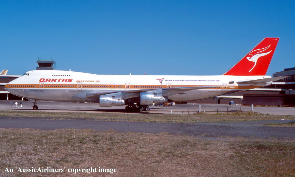 VH-EBL. Qantas Australia - 'City of Townsville' in the 'ochre' livery with additional 'Official Carrier Commonwealth Games Brisbane 1982' titles at Sydney Kingsford Smith Airport, September 17, 1982. (R. N. Smith Copyright Image 4630-439.) |