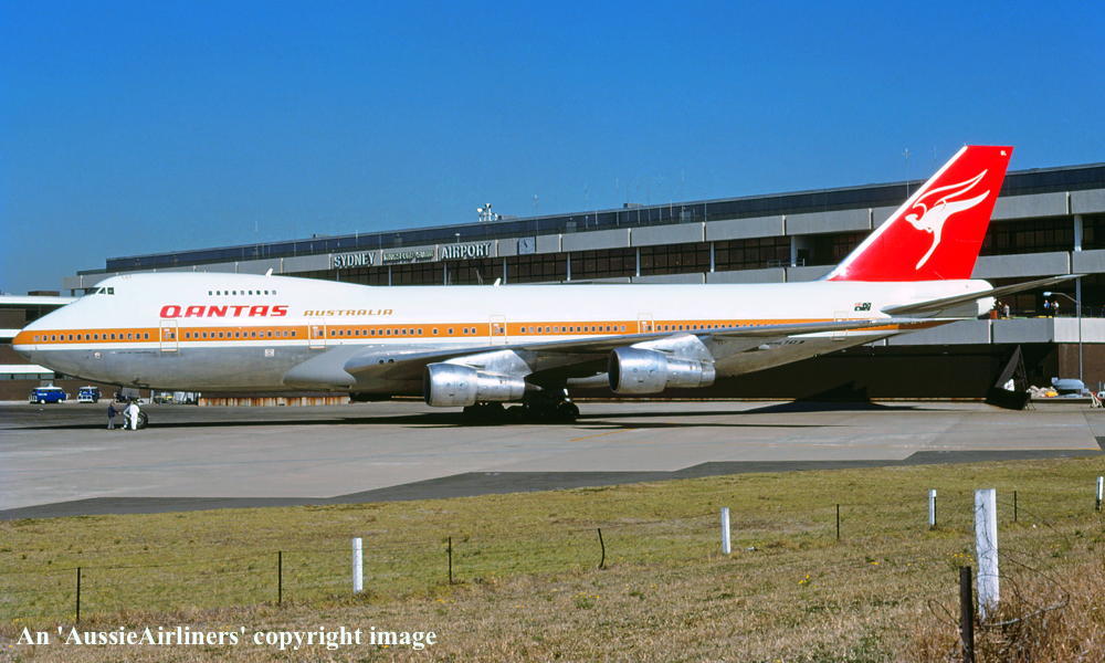 VH-EBL. Qantas Australia - 'City of Townsville' in the 'ochre' livery at Sydney Kingsford Smith Airport, January 19, 1978. (R. N. Smith Copyright Image 4630-437.) |
