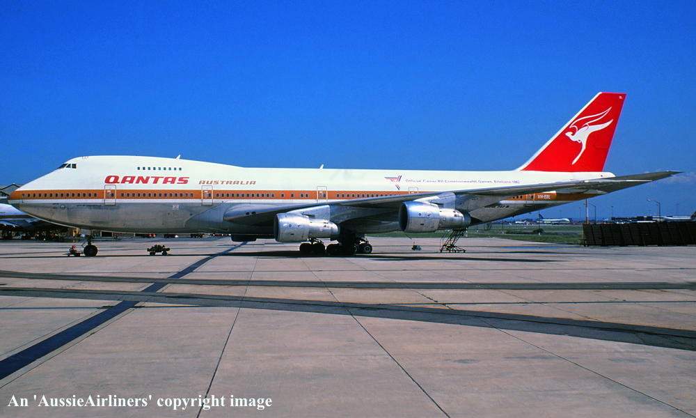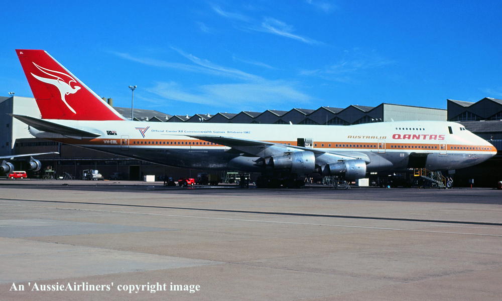 VH-EBL. Qantas Australia - 'City of Townsville' in the 'ochre' livery with additional 'Official Carrier Commonwealth Games Brisbane 1982' titles at Sydney Kingsford Smith Airport, October 01, 1982. (N. Louis Collection Copyright Image 4631-471.) |