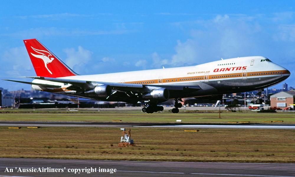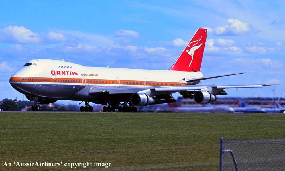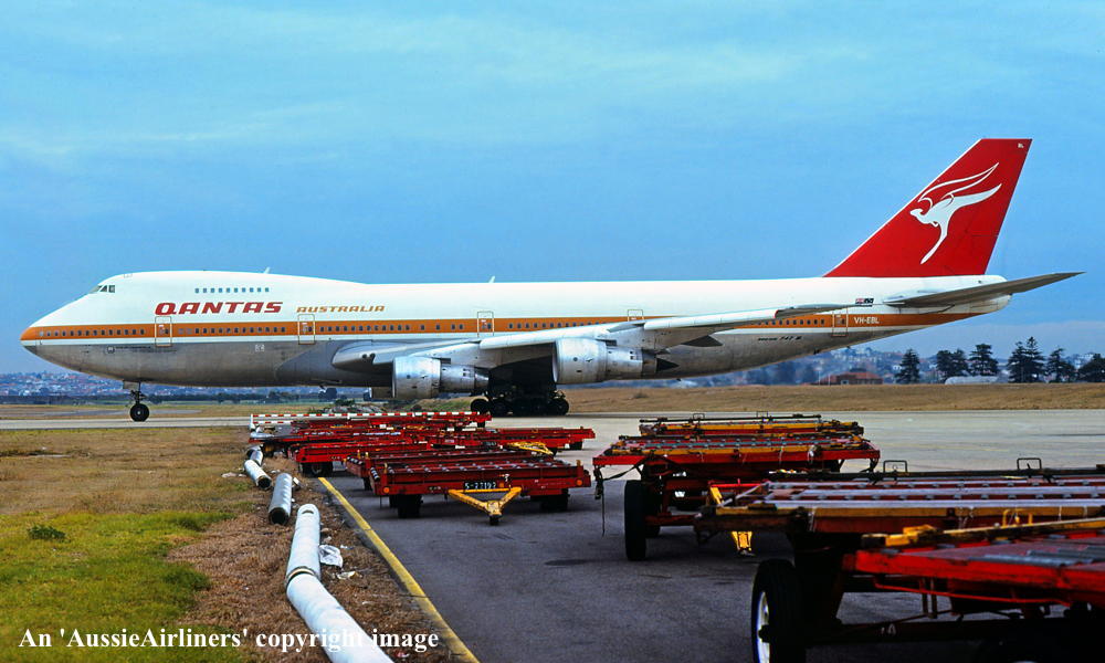 VH-EBL. Qantas Australia - 'City of Townsville' in the 'ochre' livery at Sydney Kingsford Smith Airport, April 06, 1985. (R. N. Smith Copyright Image 4630-440.) |