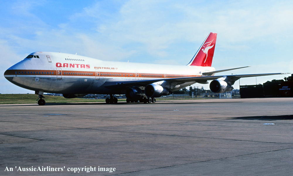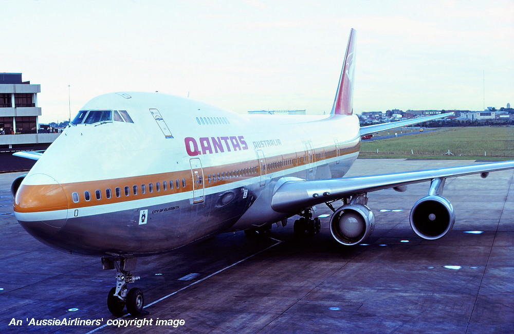 VH-EBO. Qantas Australia - 'City of Elizabeth' in the 'ochre' livery at Sydney Kingsford Smith Airport, September 02, 1983. (E. Favelle Copyright Image 4631-479.) |