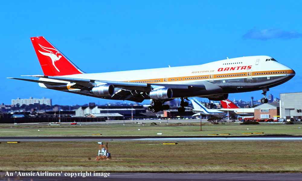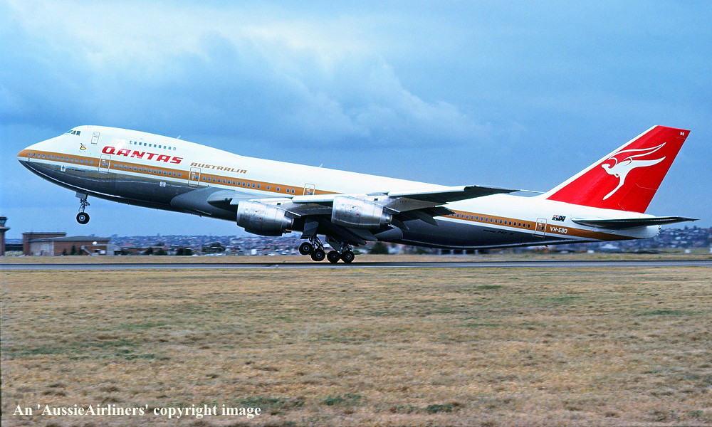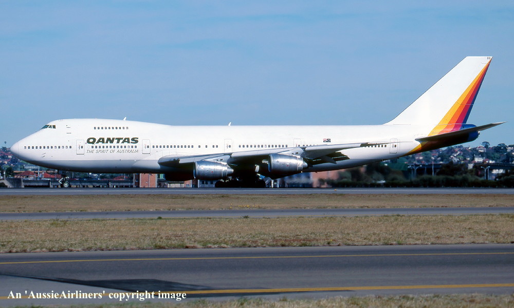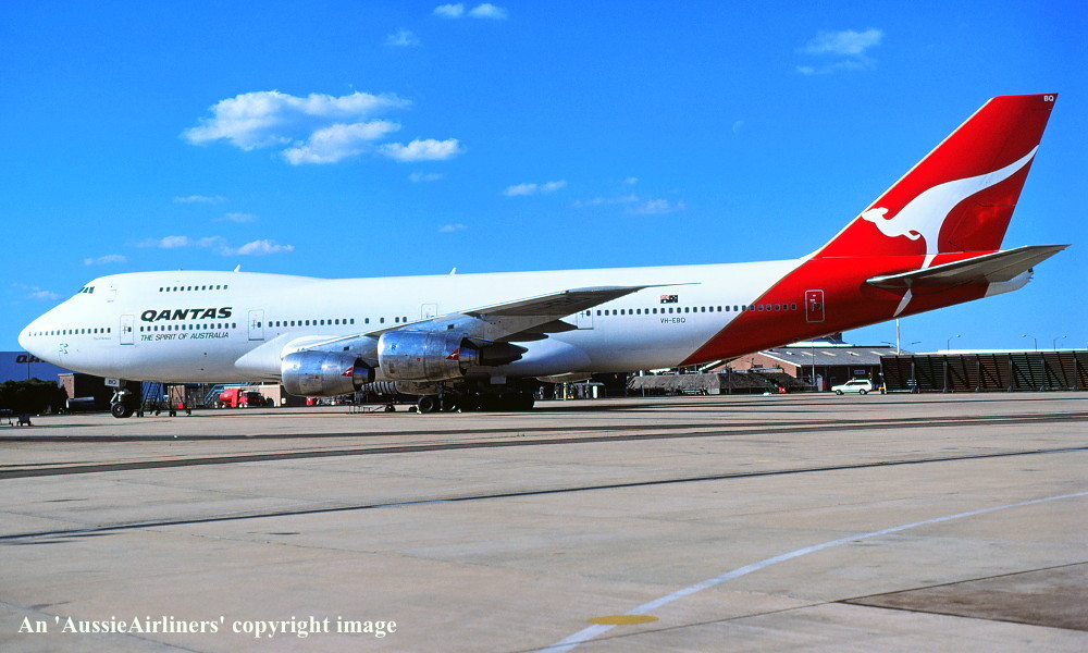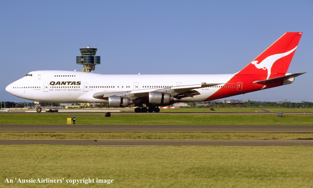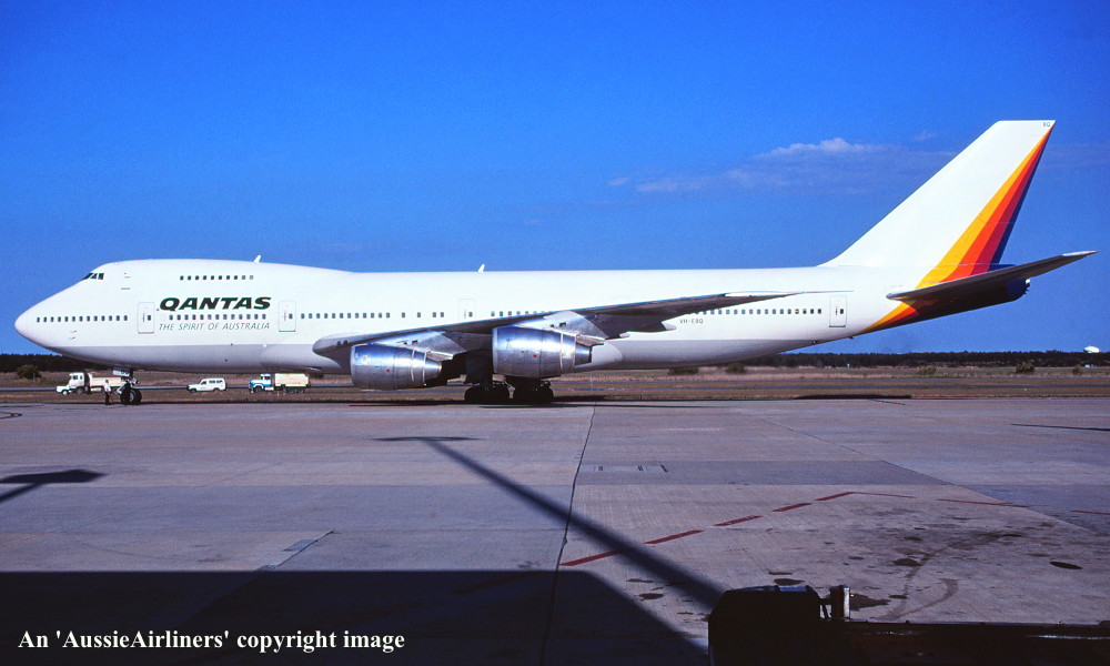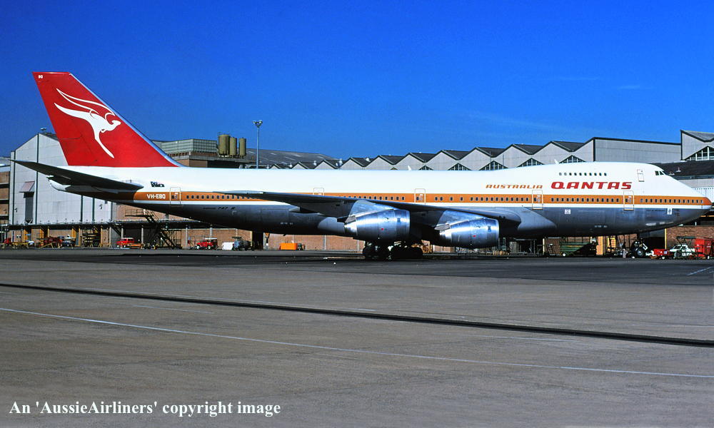 VH-EBQ. Qantas The Spirit Of Australia - 'City of Bunbury' in the standard livery at Sydney Kingsford Smith Airport, May 1989. (R. N. Smith Copyright Image 4630-811.) |