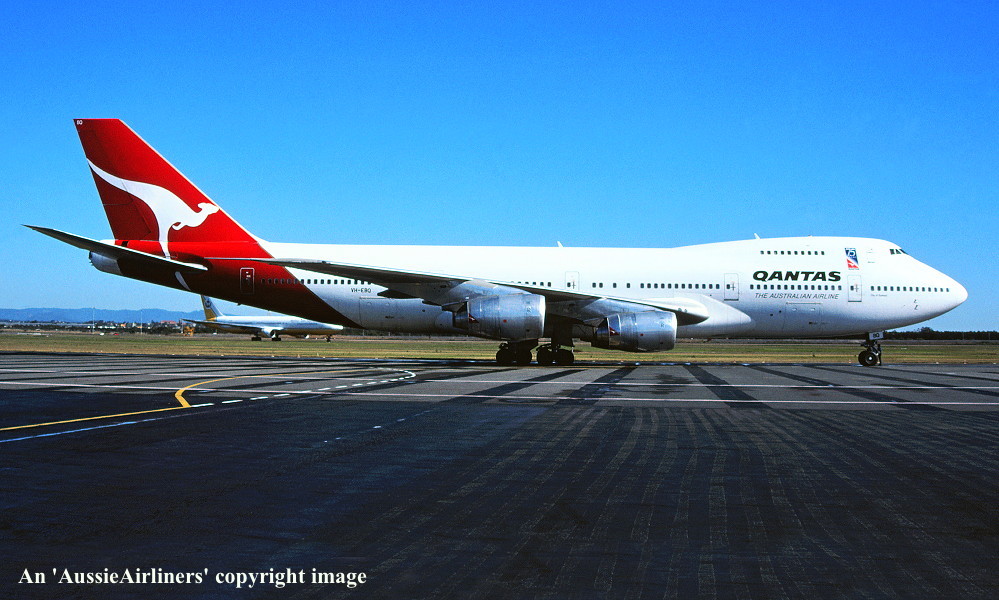 VH-EBQ. Qantas The Spirit Of Australia - 'City of Bunbury' in the standard livery at Sydney Kingsford Smith Airport, January 1998. (R. N. Smith Copyright Image 4630-009.) |