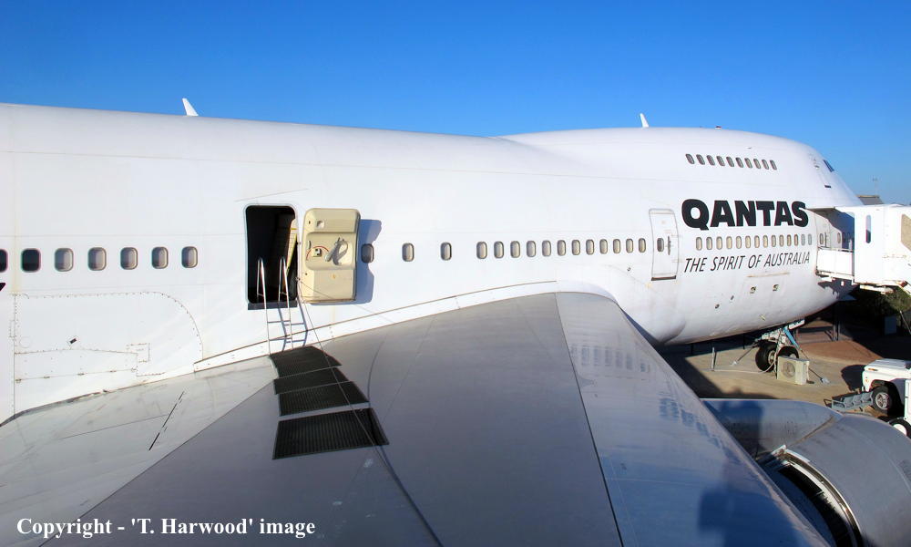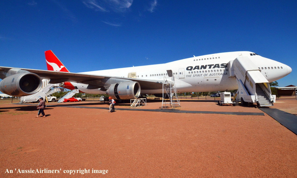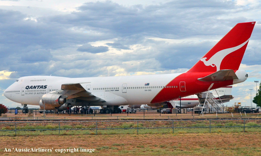 VH-EBQ. Qantas The Spirit Of Australia - 'City of Bunbury' in the standard livery at Longreach Airport, February 09, 2015. Set-up for the tourist 'wing-walk' experience. (T. Harwood Copyright Image 4631-859.) |