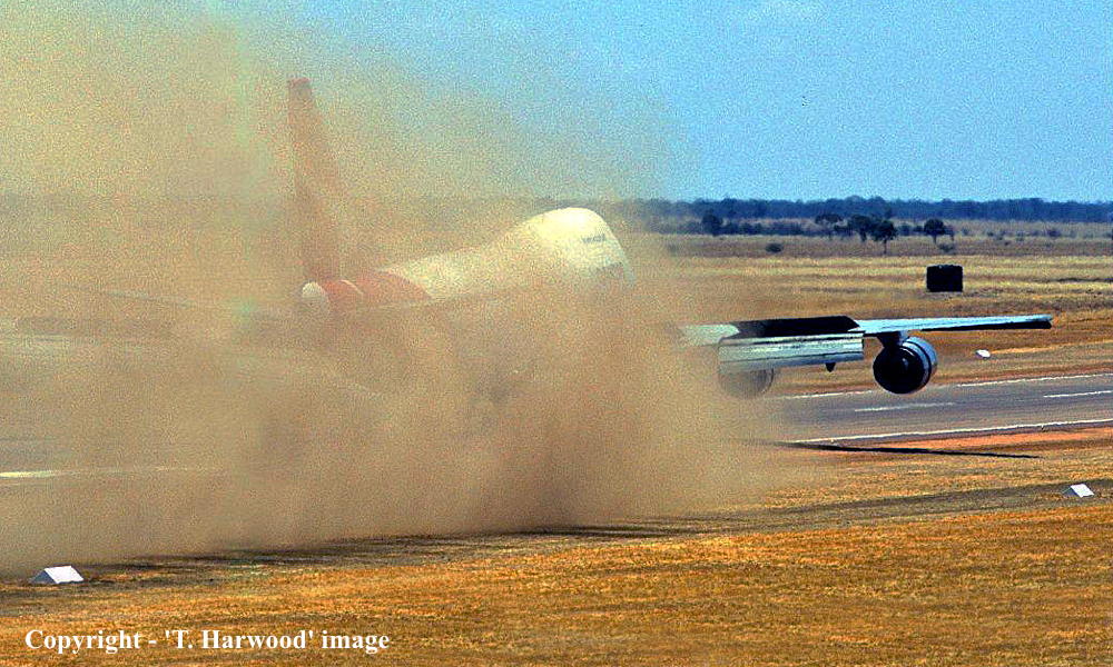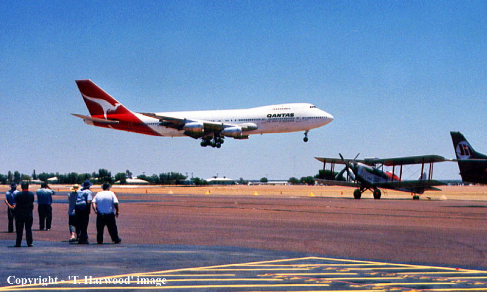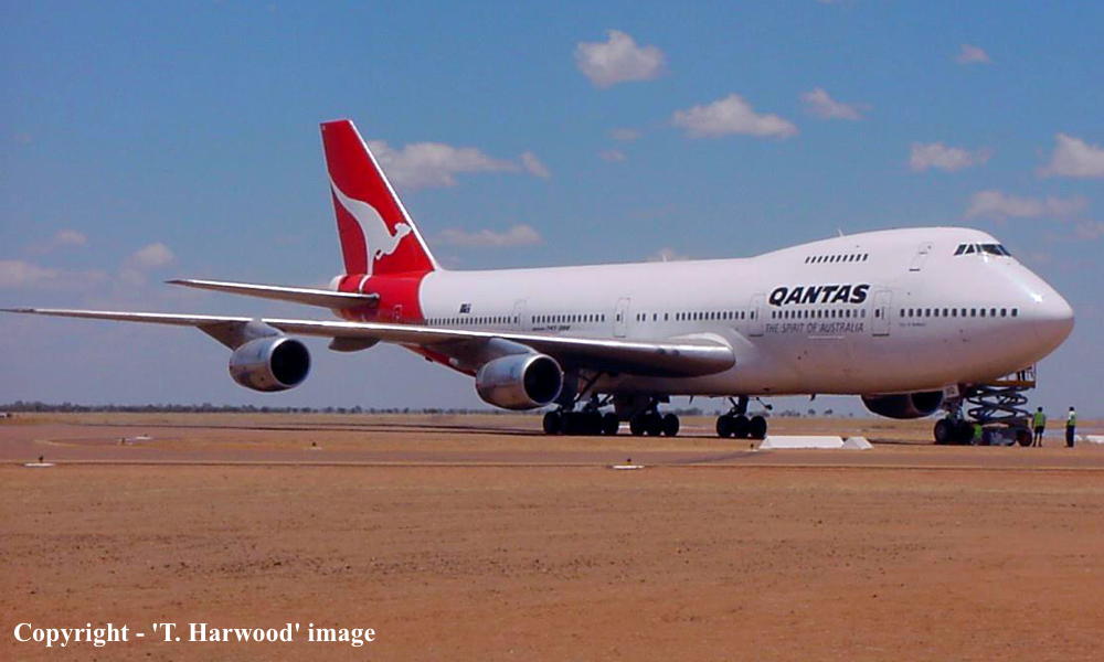 VH-EBQ. Qantas The Spirit Of Australia - 'City of Bunbury' in the standard livery at Longreach Airport, November 11, 2002. (T. Harwood Copyright Image 4631-849.) |