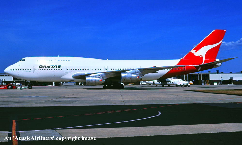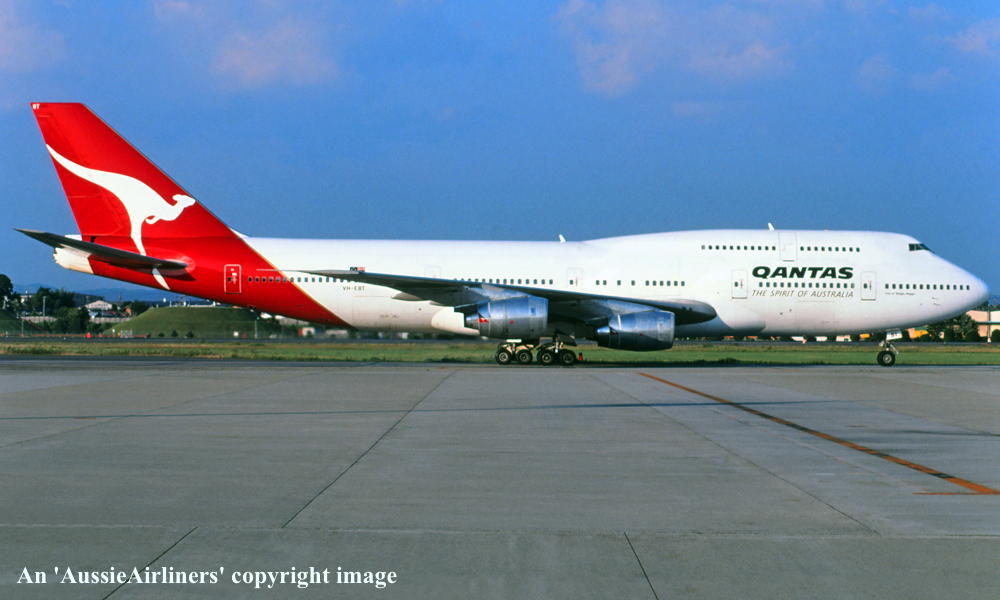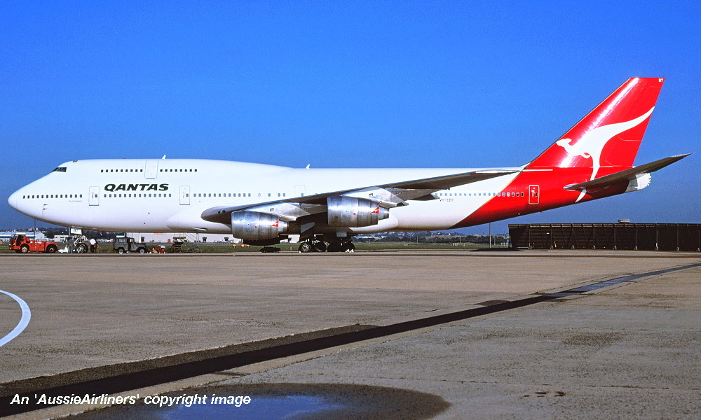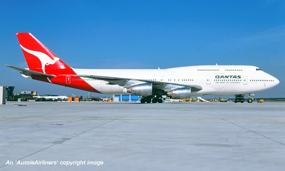 VH-EBT. Qantas The Spirit Of Australia - 'City of Wagga Wagga' in the standard livery at Frankfurt Airport, October 1989. (R. N. Smith Collection Copyright Image 4631-124.) |