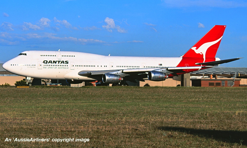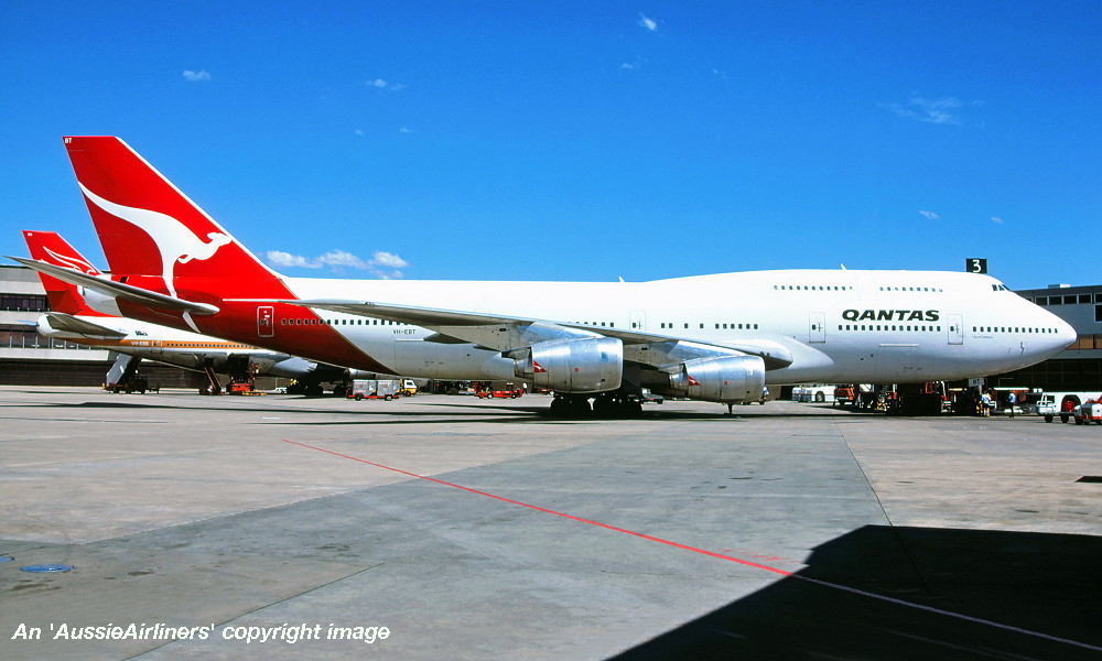 VH-EBT. Qantas The Spirit Of Australia - 'City of Wagga Wagga' in the standard livery at an unknown airport, date unknown. (R. N. Smith Collection Copyright Image 4631-487.) |