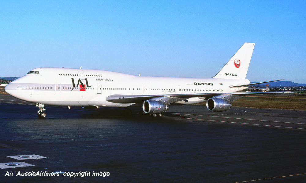 VH-EBT. Japan Airlines - in a modified livery with additional 'Qantas' titles at Brisbane Airport, June 1992. (R. N. Smith Collection Copyright Image 4630-824.) |