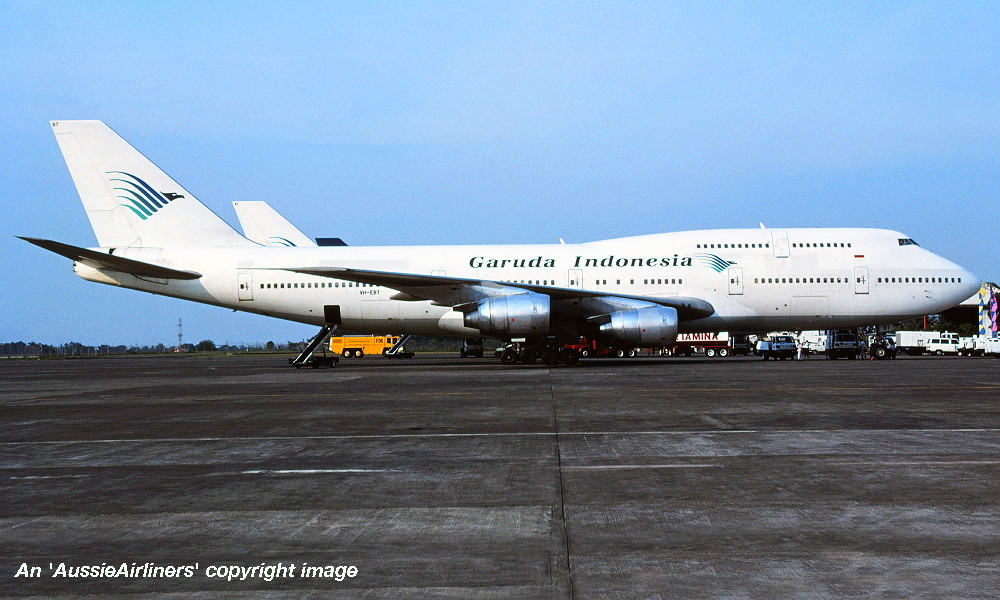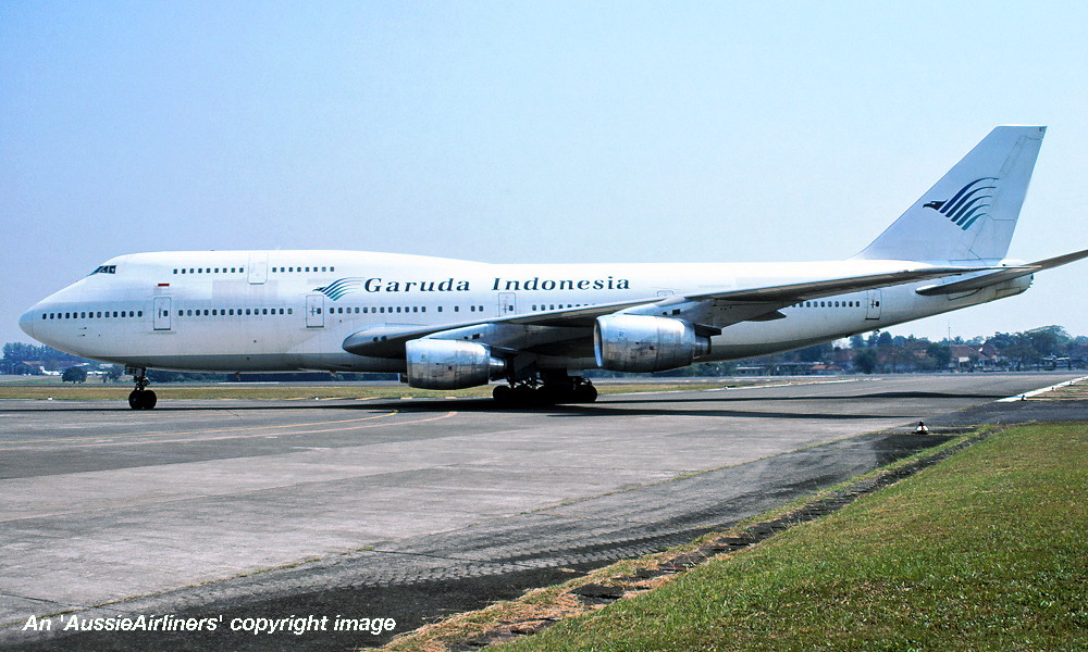 VH-EBT. Garuda Indonesia - in the all-white livery at Jakarta Halim Airport, July 1994. (R. N. Smith Collection Copyright Image 4631-125.) |