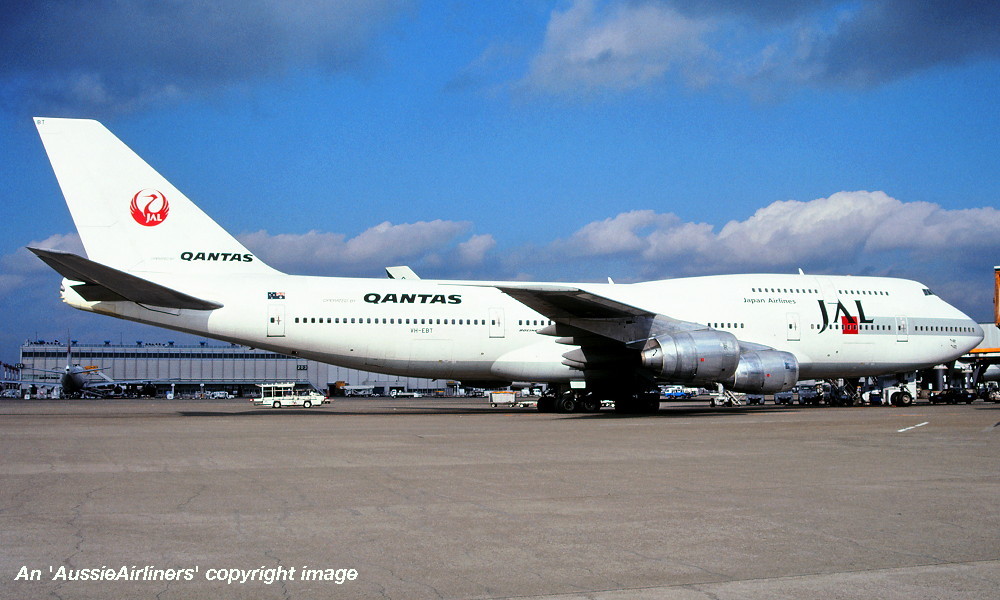 VH-EBT. Japan Airlines - in a modified livery with additional 'Qantas' titles at Tokyo Narita Airport, August 1992. (R. N. Smith Collection Copyright Image 4631-136.) |