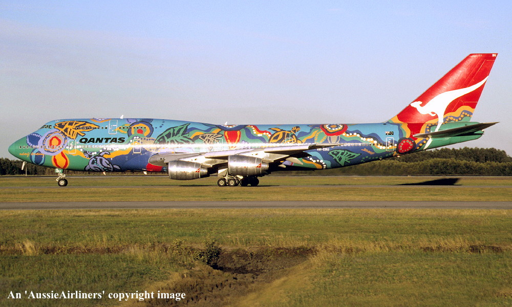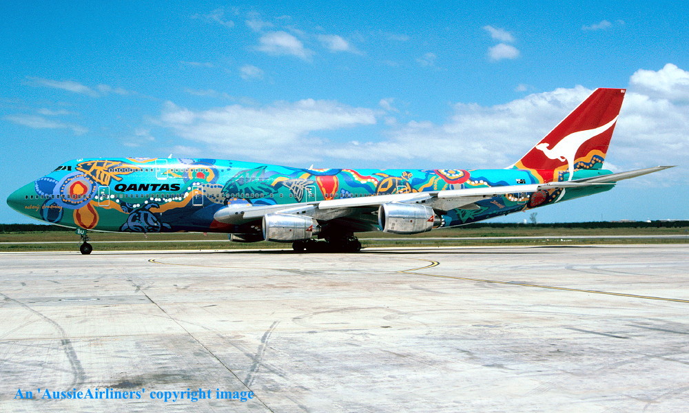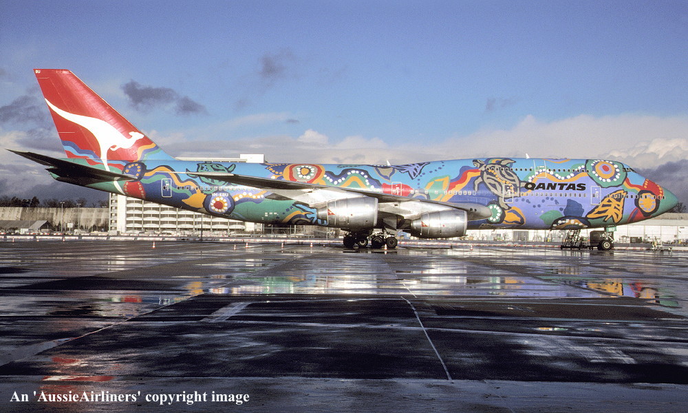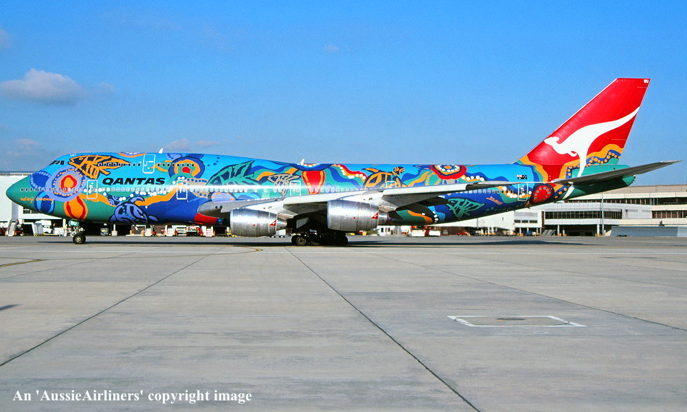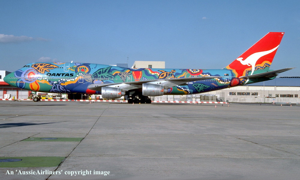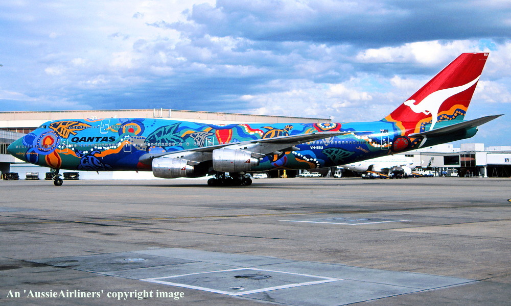 VH-EBU. Qantas - 'Nalanji Dreaming' in the aboriginal livery at Sydney Kingsford Smith Airport, June 27, 2004. (G. Hutchison Copyright Image 4631-713.) |