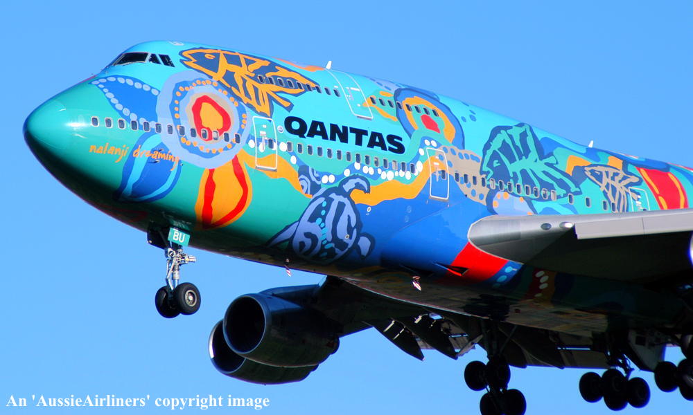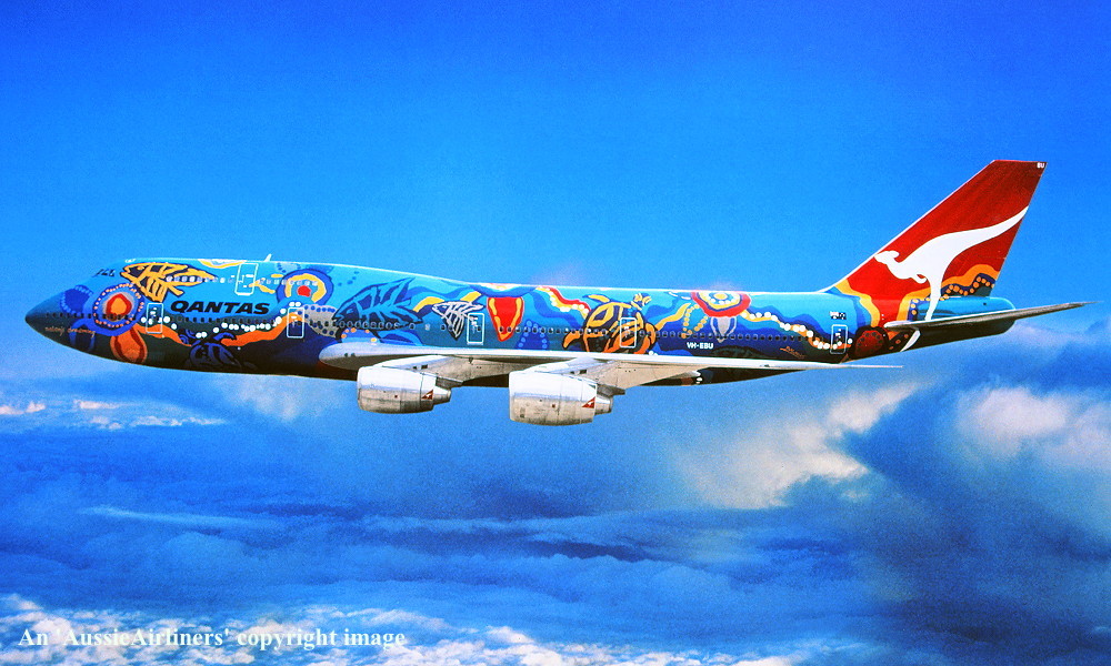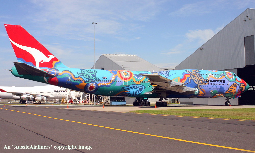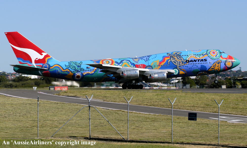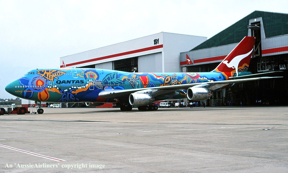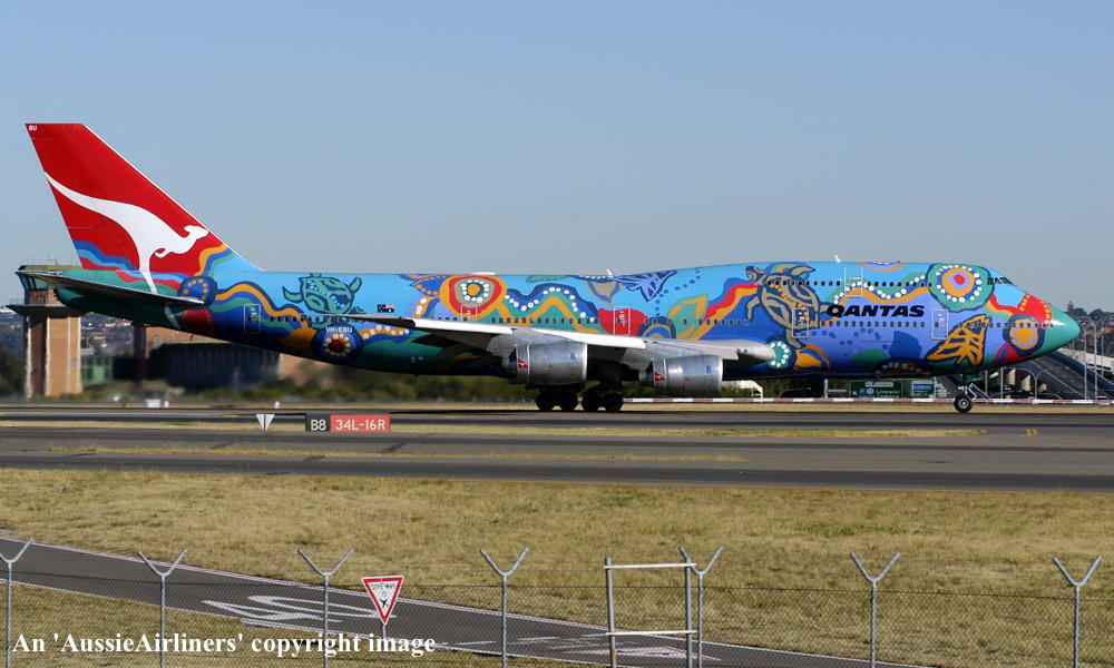 VH-EBU. Qantas - 'Nalanji Dreaming' in the aboriginal livery at Sydney Kingsford Smith Airport, June 27, 2004. (G. Hutchison Copyright Image 4631-713.) |