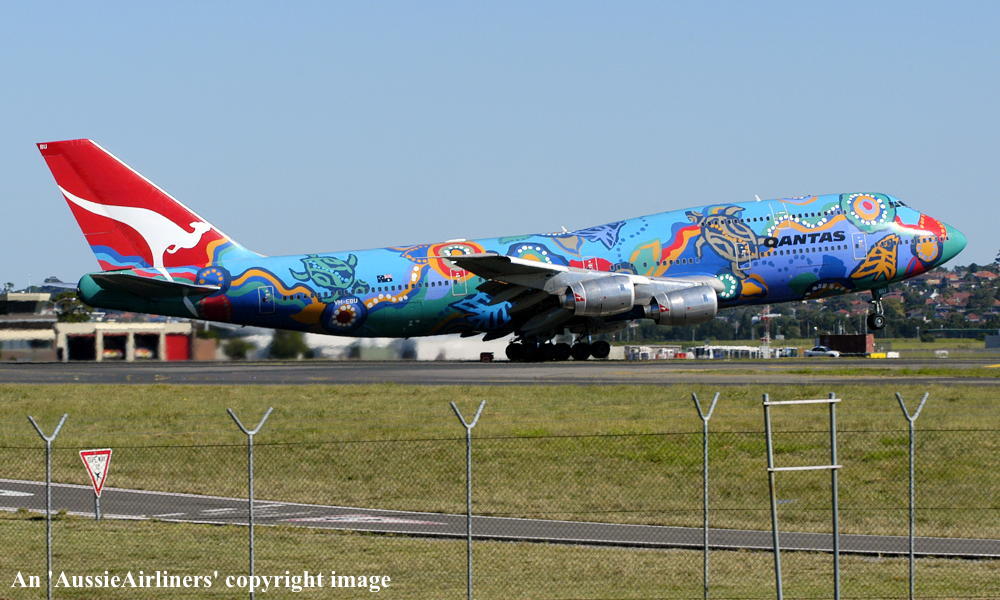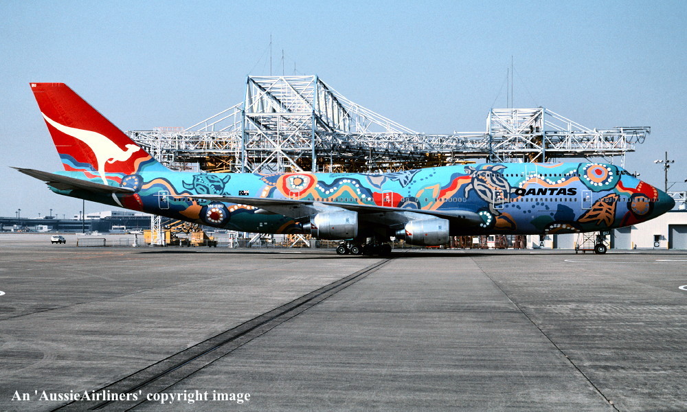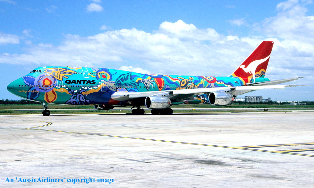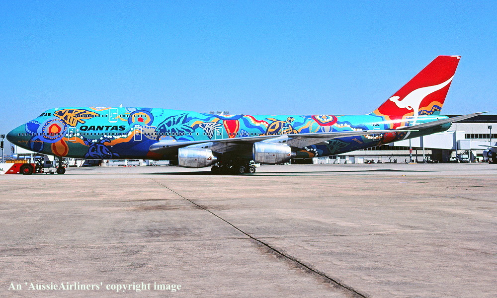 VH-EBU. Qantas - 'Nalanji Dreaming' in the aboriginal livery at Sydney Kingsford Smith Airport, April 25, 2004. (G. Hutchison Copyright Image 4631-711.) |