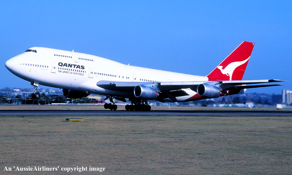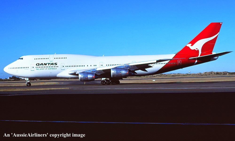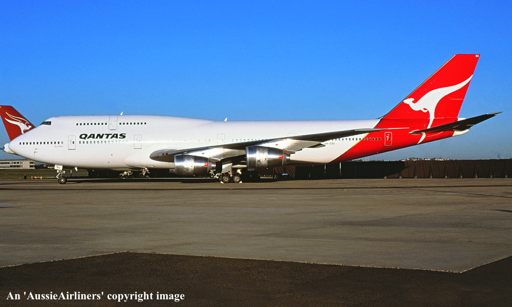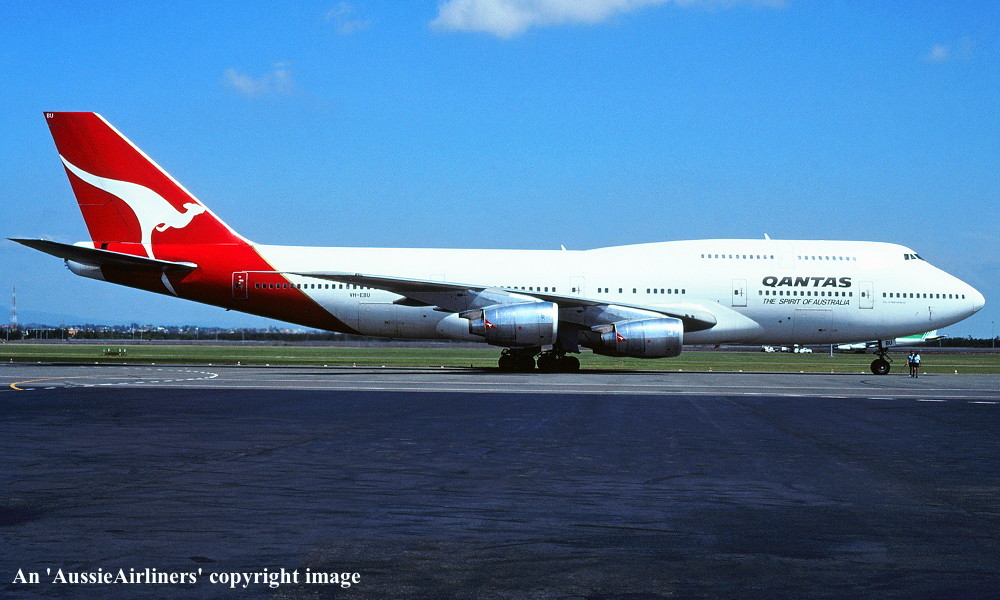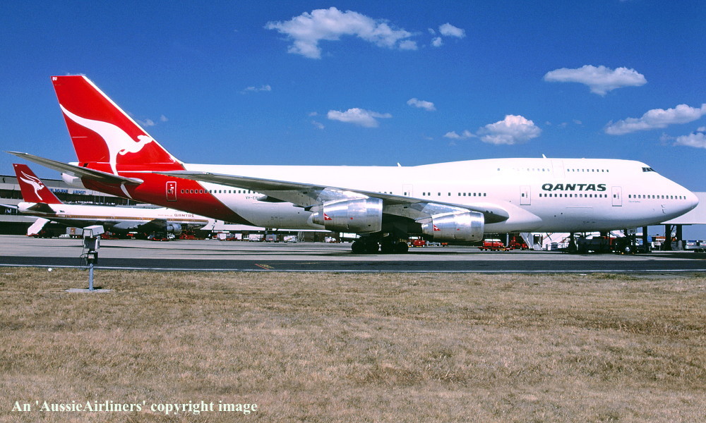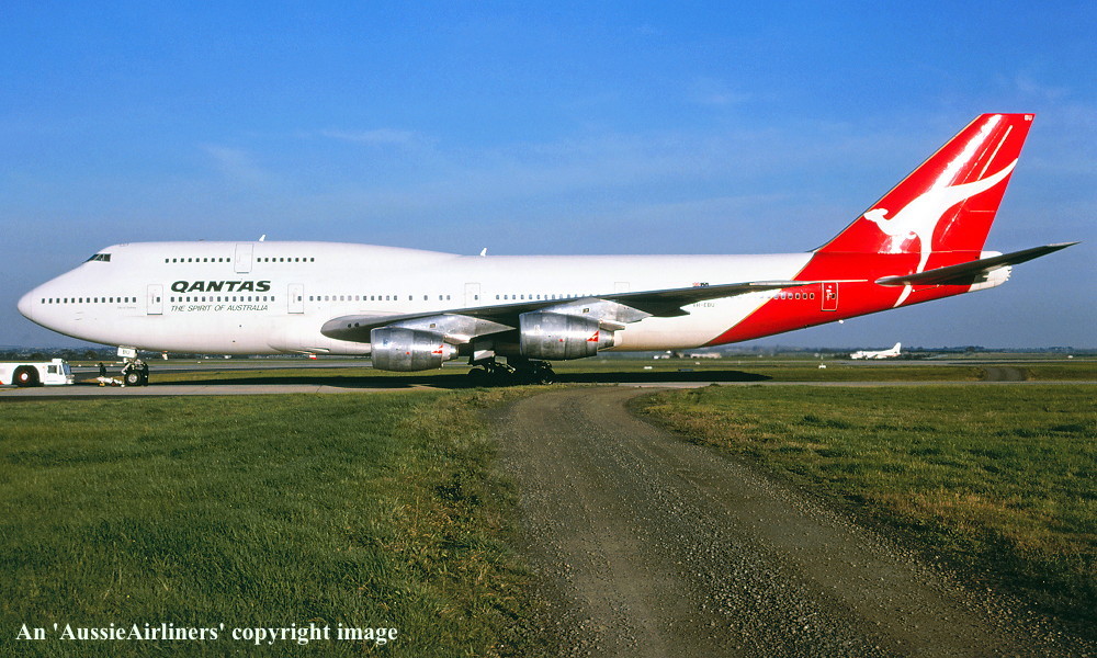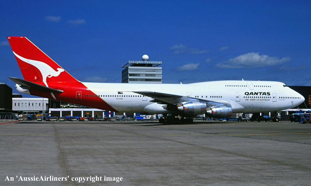 VH-EBU. Qantas The Spirit Of Australia - 'City of Warrnambool' in the standard livery at Sydney Kingsford Smith Airport, June 1992. (R. N. Smith Copyright Image 4630-184.) |