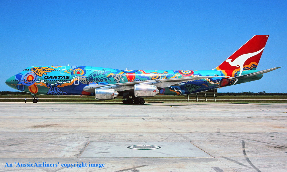 VH-EBU. Qantas - 'Nalanji Dreaming' in the aboriginal livery at Sydney Kingsford Smith Airport, April 25, 2004. (G. Hutchison Copyright Image 4631-712.) |