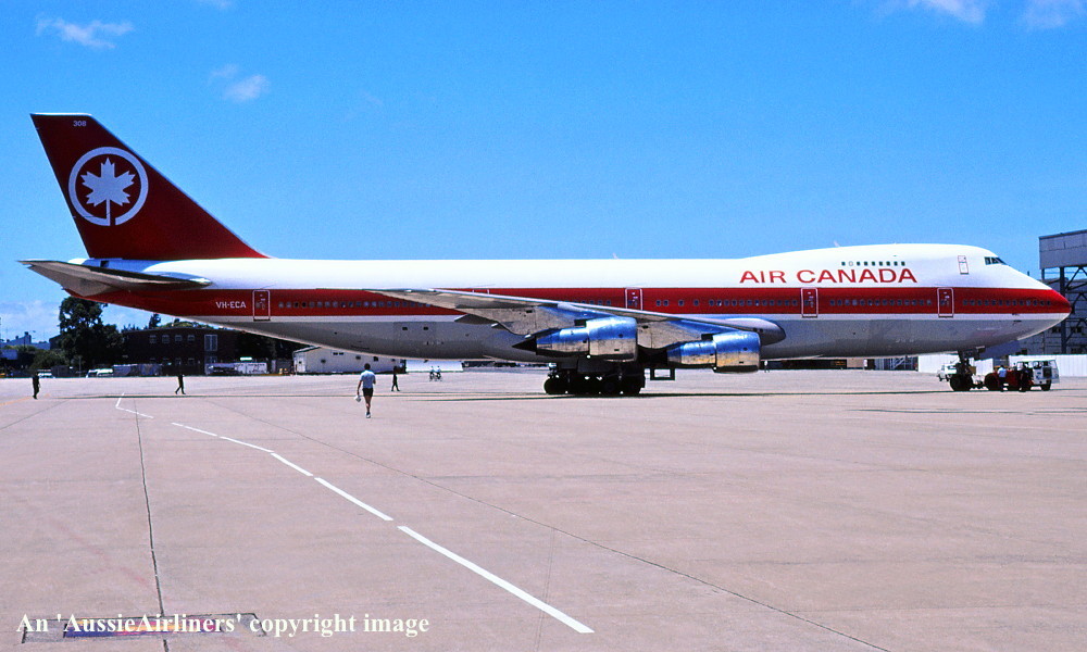 VH-ECA. Air Canada - in the standard livery at Sydney Kingsford Smith Airport, January 1988. (N.Louis Collection Copyright Image 4631-509.) |