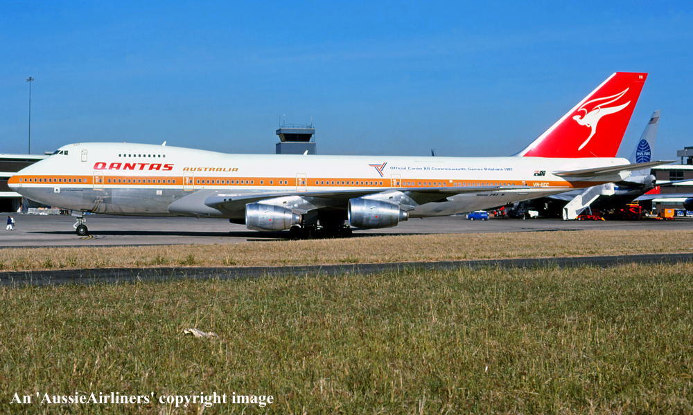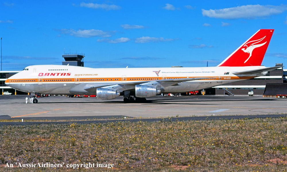 VH-ECC. Qantas Australia - 'City of Shepparton' in the 'ochre' livery with additional 'Official Carrier Commonwealth Games Brisbane 1982' titles at Sydney Kingsford Smith Airport, September 19, 1981. (R. N. Smith Copyright Image 4630-936.) |