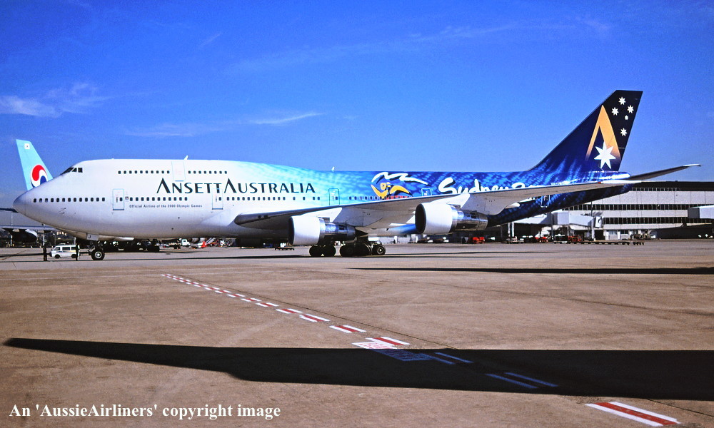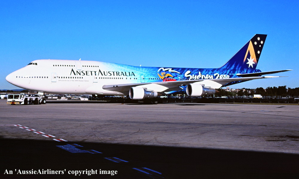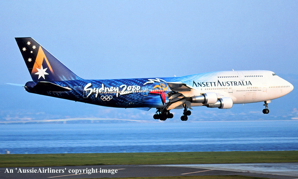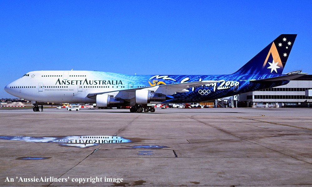VH-INJ. Ansett Australia - in the 'Starmark' livery with additional 'Sydney 2000 Olympic Games' makings at Sydney Kingsford Smith Airport, July 12, 1997. (R. N. Smith Copyright Image 4630-795.) |