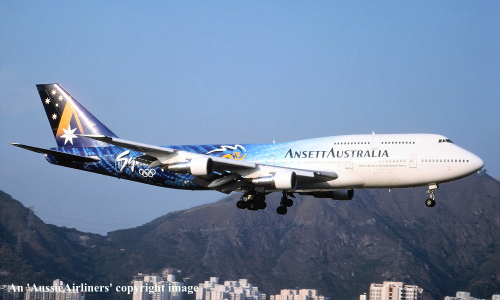 VH-INJ. Ansett Australia - in the 'Starmark' livery with additional 'Sydney 2000 Olympic Games' makings at Hong Kong Kai Tak Airport, June 1997. (R. N. Smith Collection Copyright Image 4630-686.) |