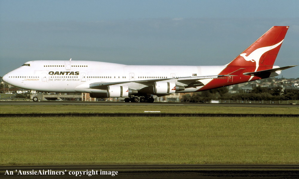VH-OED. Qantas The Spirit Of Australia - 'Kangaroo Island' in the standard livery at Sydney Kingsford Smith Airport, March 1999. (R. N. Smith Copyright Image 4631-027.) |