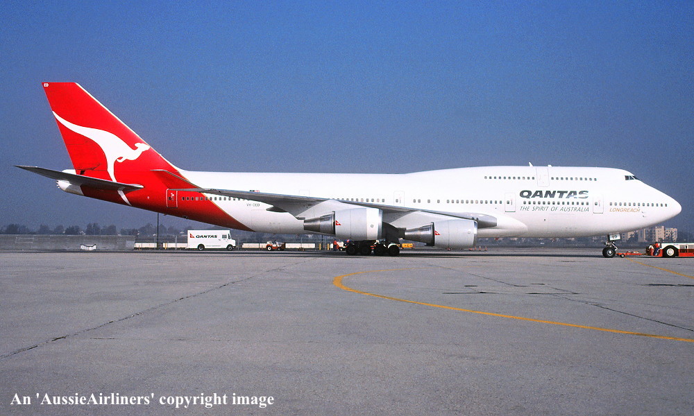 VH-OED. Qantas The Spirit Of Australia - 'Kangaroo Island' in the standard livery at Los Angeles Airport, December 1998. (R. N. Smith Collection Copyright Image 4631-198.) |
