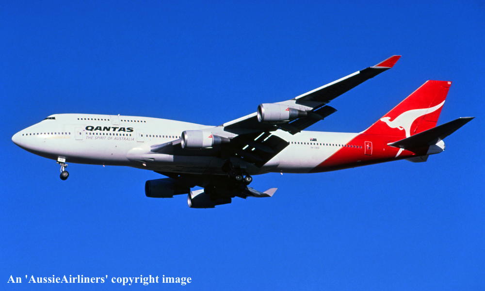 VH-OED. Qantas The Spirit Of Australia - 'Kangaroo Island' in the standard livery at Sydney Kingsford Smith Airport, March 2005. (R. N. Smith Copyright Image 4630-194.) |