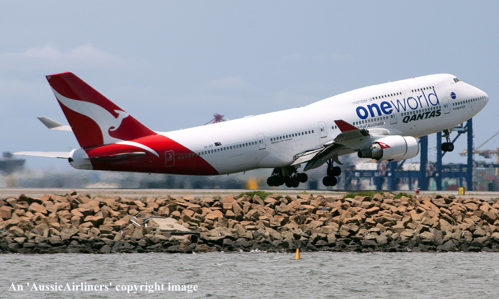 VH-OEF. Qantas Spirit of Australia - 'Sydney' in the 'New Roo' livery with additional 'One World' titles at Sydney Kingsford Smith Airport, August 14, 2018. (D. Gibbs Copyright Image 4631-748.) |