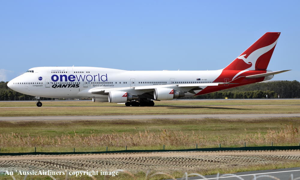 VH-OEF. Qantas Spirit of Australia - 'Sydney' in the 'New Roo' livery with additional 'One World' titles at Brisbane Airport, June 2018. (R. N. Smith Collection Copyright Image 4631-627.) |