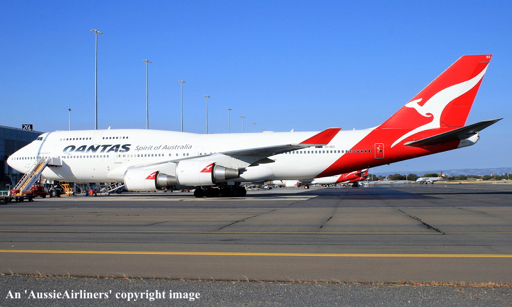 VH-OEG. Qantas Spirit of Australia - 'Parkes' in the 'New Roo' livery at Adelaide West Beach Airport, January 19, 2014. (R. Brown Copyright Image 4631-050.) |