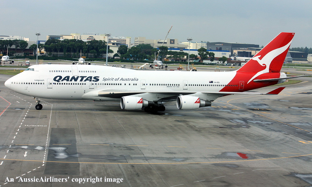 VH-OEG. Qantas Spirit of Australia - 'Parkes' in the 'New Roo' livery at Singapore Airport, October 30, 2013. (T. Haynes Copyright Image 4631-165.) |