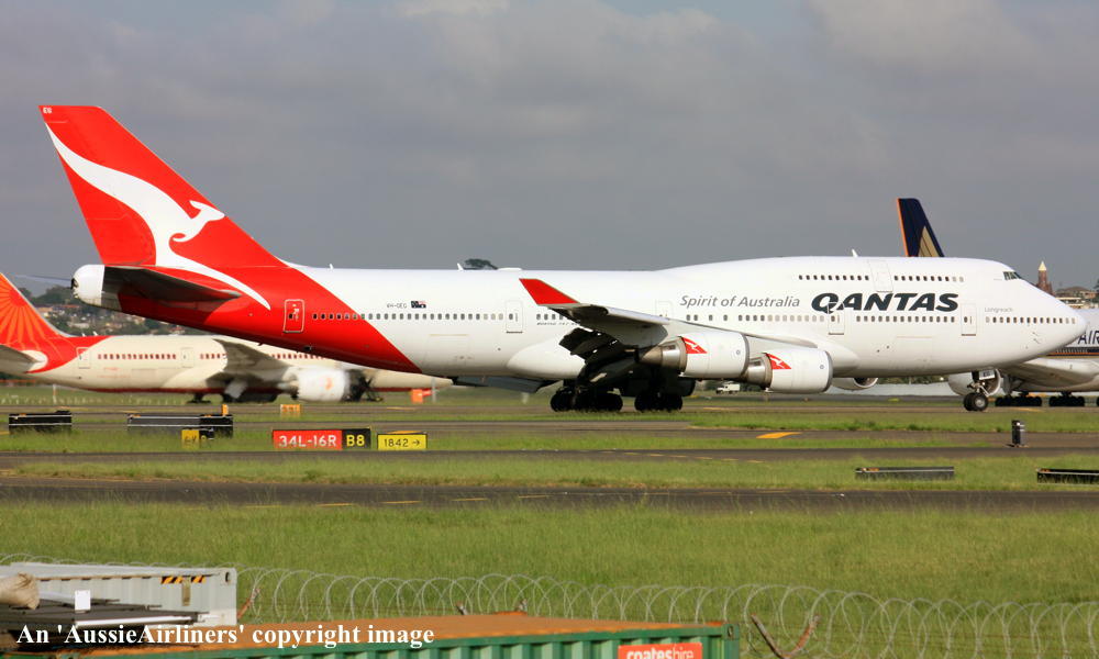 VH-OEG. Qantas Spirit of Australia - 'Parkes' in the old livery at Sydney Kingsford Smith Airport, March 2005. (R. N. Smith Collection Copyright Image 4630-193.) |