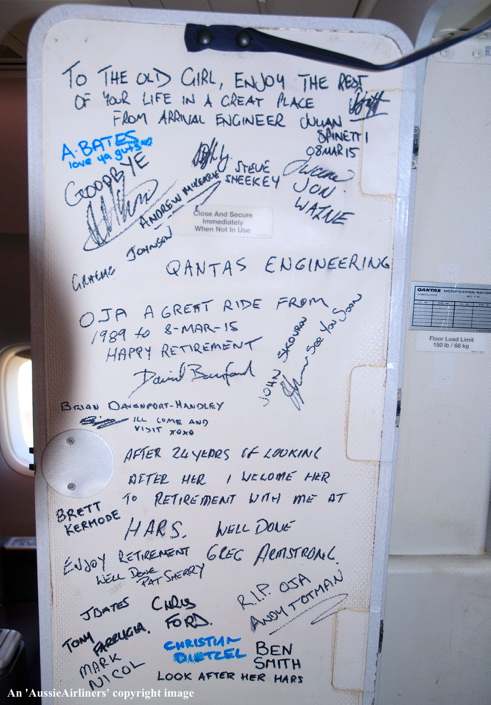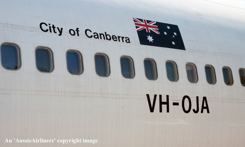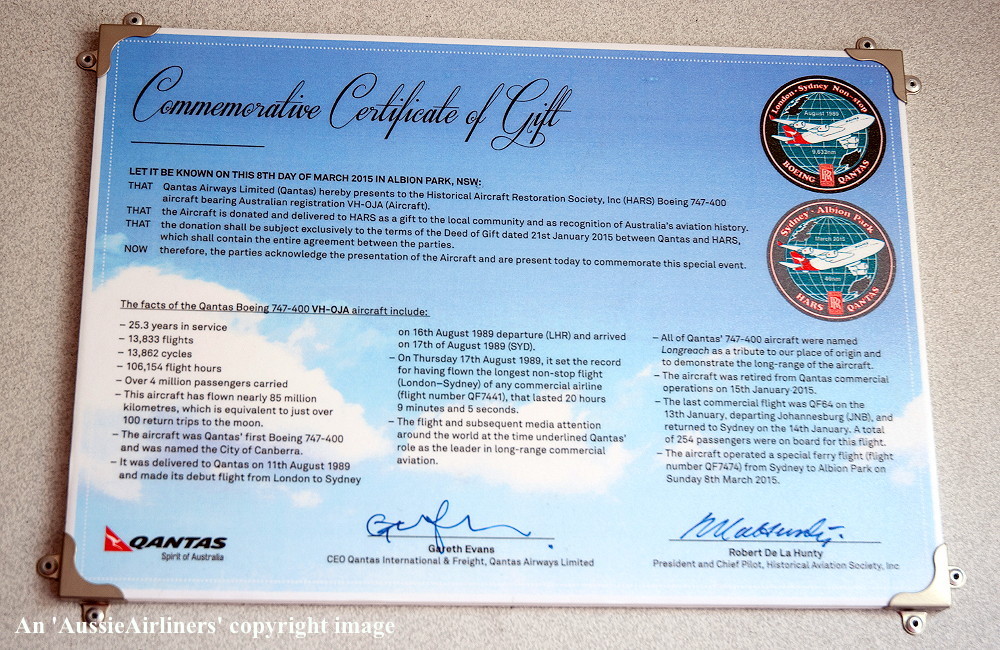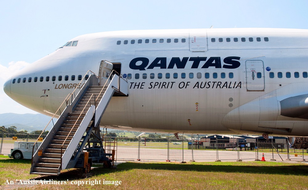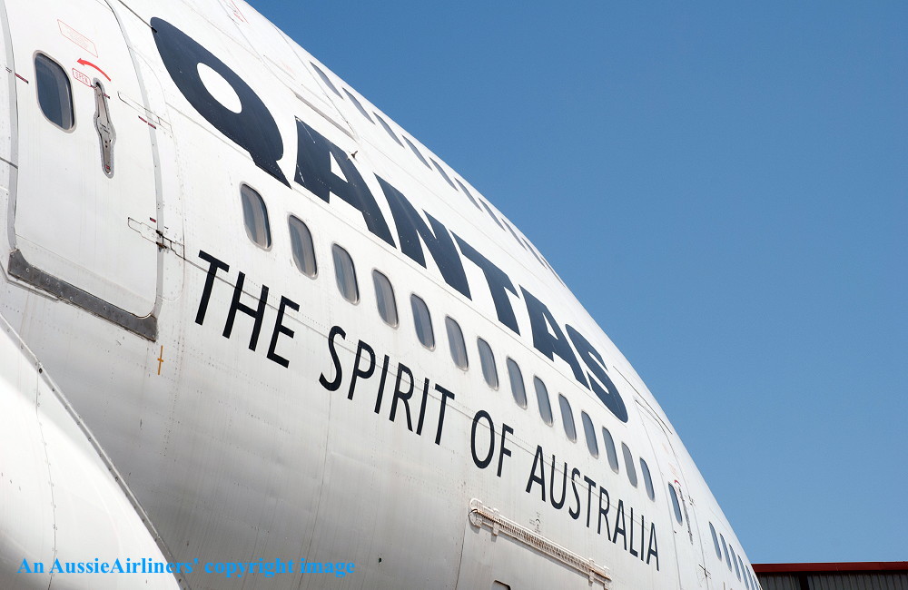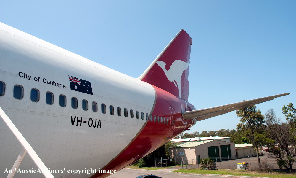 VH-OJA. Qantas The Spirit of Australia - 'City of Canberra' in the standard livery at the Illawarra Regional Airport, November 24, 2015. This tour presents the aircraft as displayed to the public. (G. Louis Copyright Image 4631-229.)