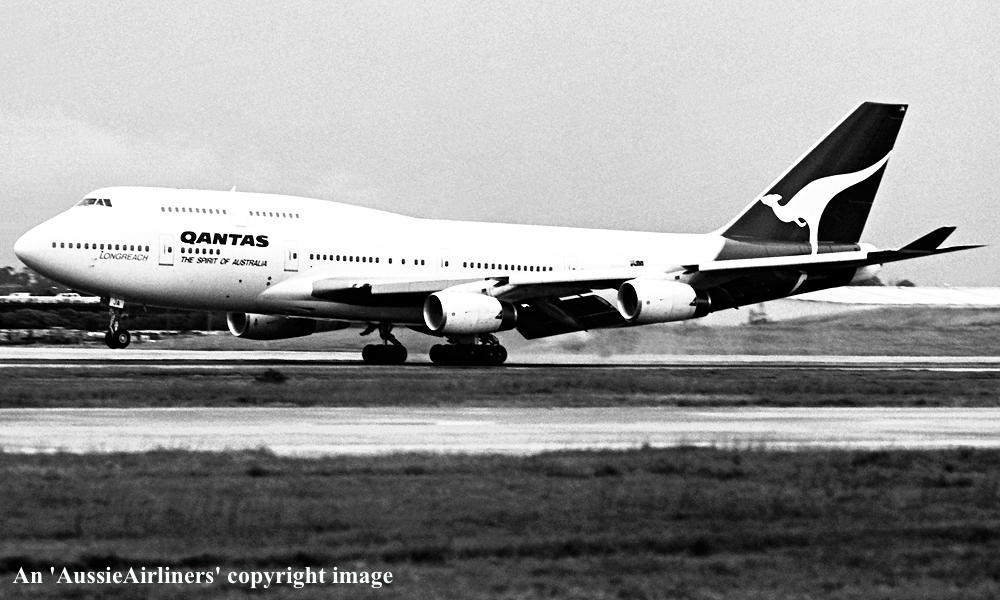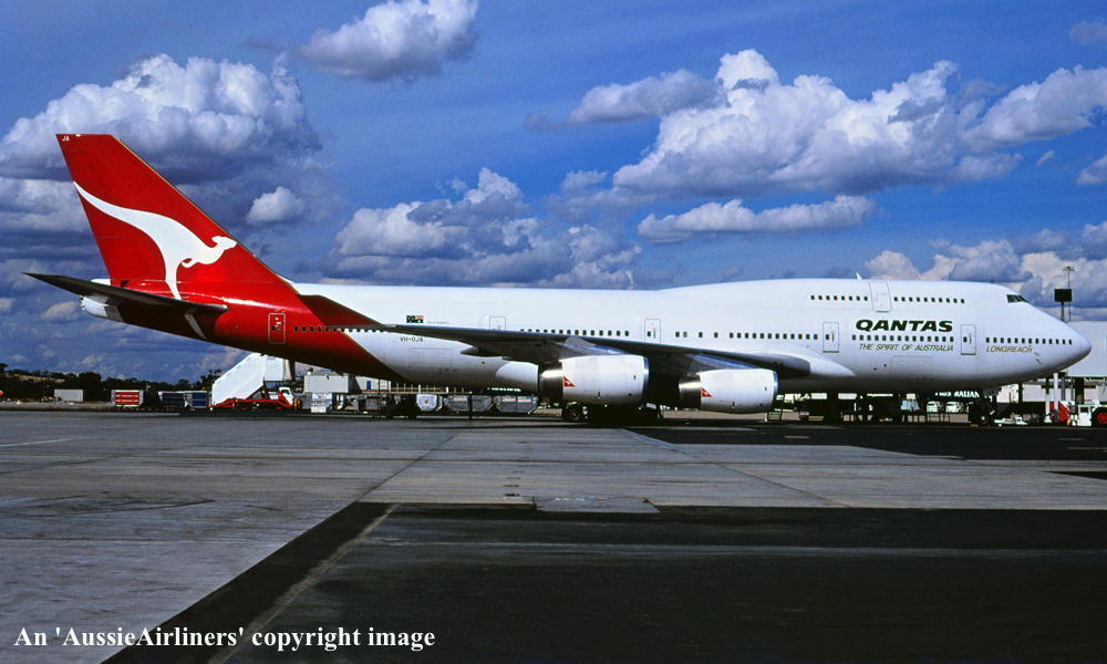 VH-OJA. Qantas The Spirit of Australia - 'City of Canberra' in the standard livery at Sydney Kingsford Smith Airport, August 17, 1989. (Qantas Heritage Collection Copyright Image 4630-755.) |