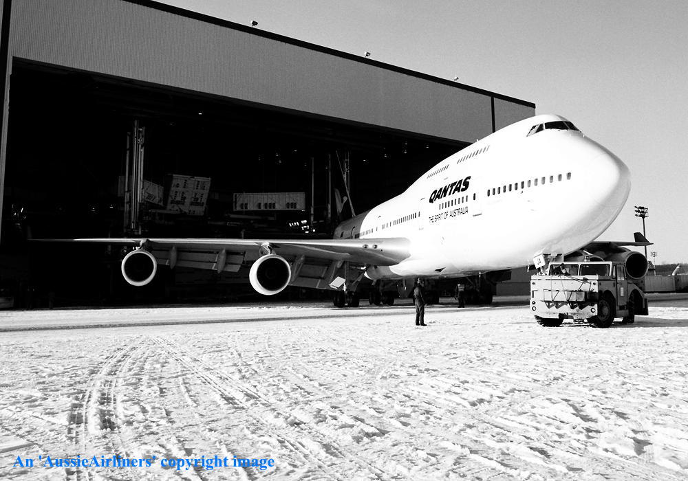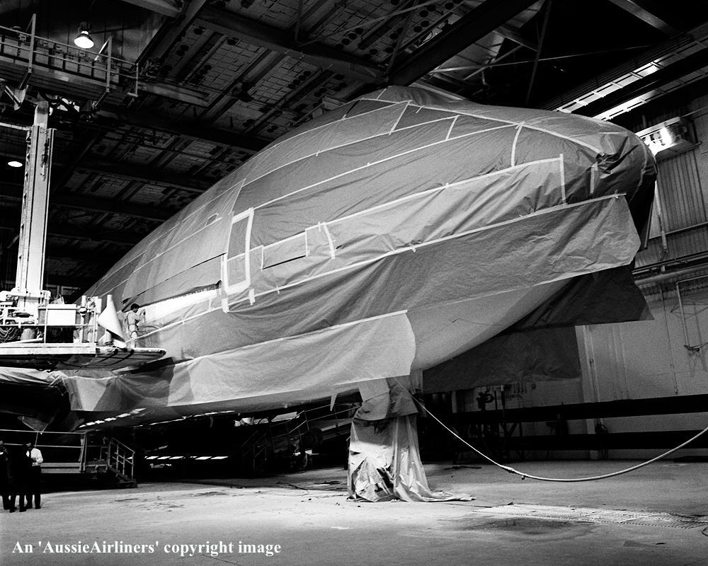 VH-OJA. Qantas Airways - in the paint shop at the Boeing Everett plant, January 1989. (Qantas Heritage Collection Copyright Image 4630-758.) |
