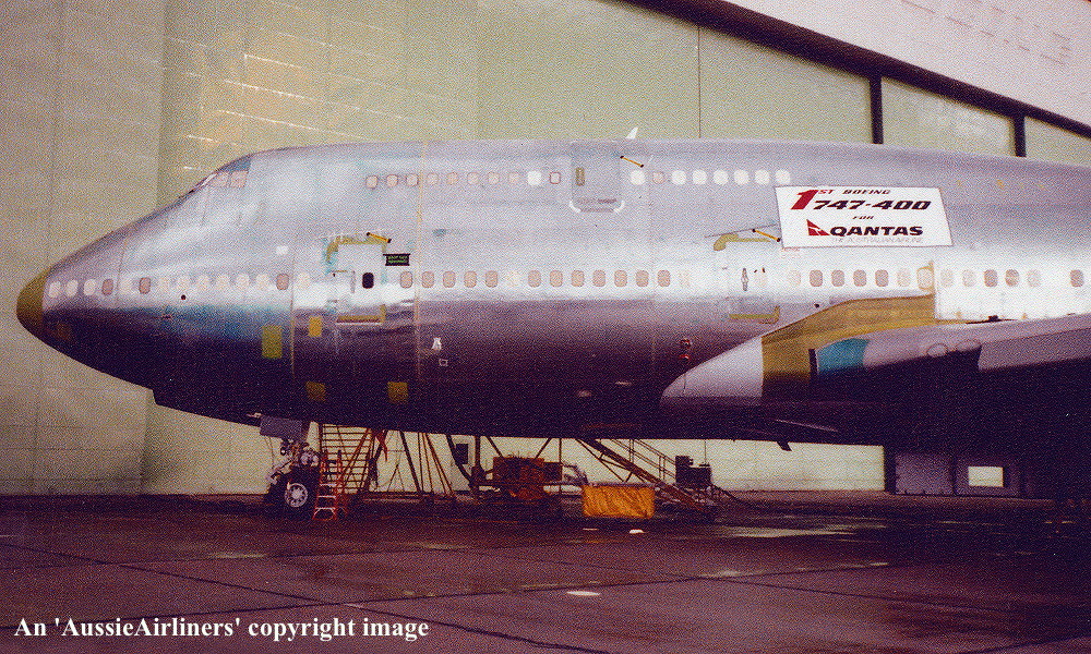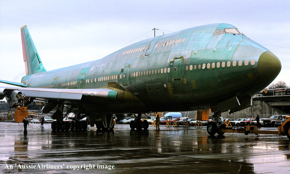 VH-OJA. Qantas Airways - awaiting painting and the installation of engines at the Boeing Everett plant, January 13, 1989. (P. Hockey Copyright Image 4631-059.) |