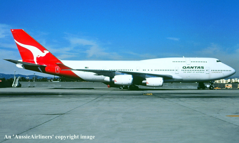 VH-OJA. Qantas The Spirit of Australia - 'City of Canberra' in the standard livery at Los Angeles Airport, January 2000. (B. Gore Copyright Image 4631-109.) |