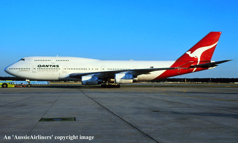 VH-OJA. Qantas The Australian Airline - 'City of Canberra' in the standard livery at Frankfurt Airport, July 1996. (R. N. Smith Collection Copyright Image 4631-532.) |
