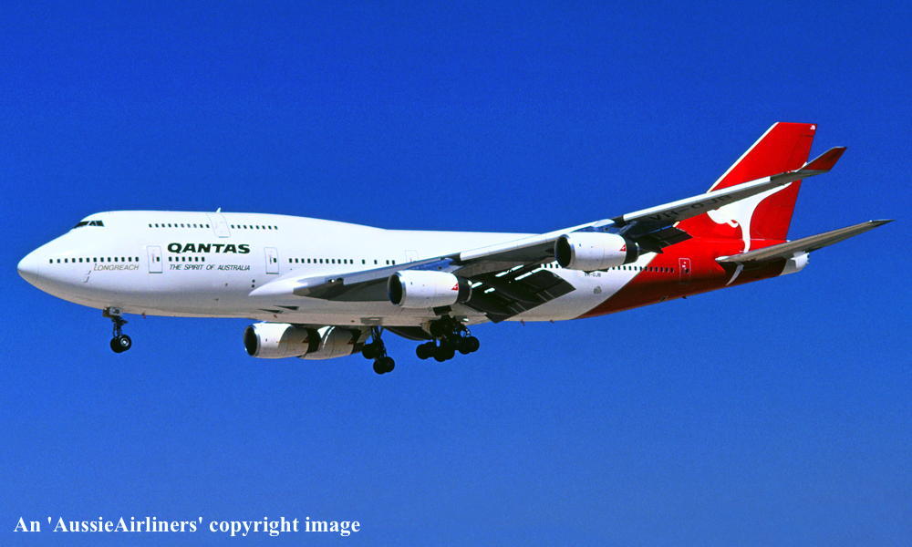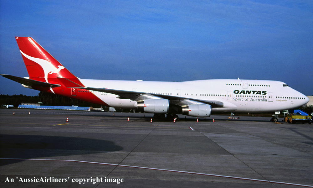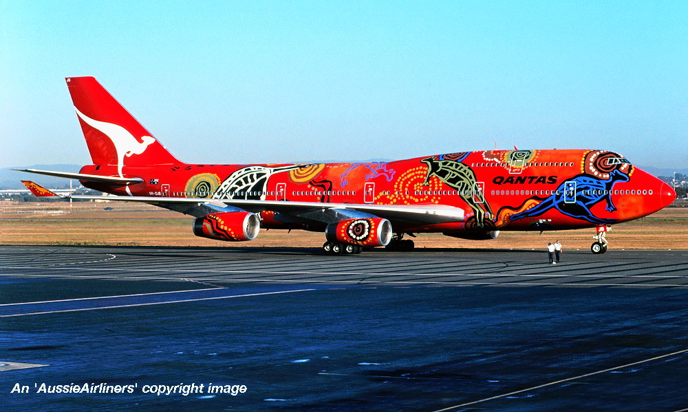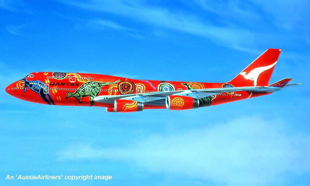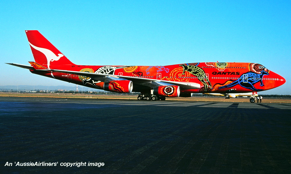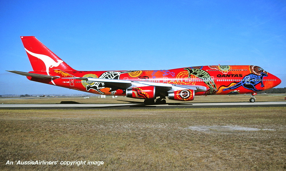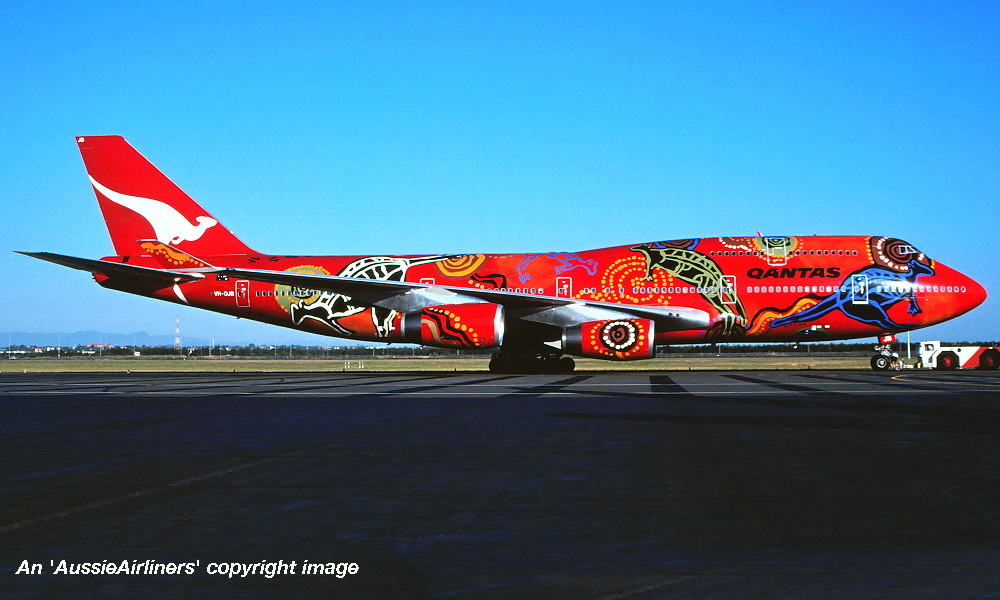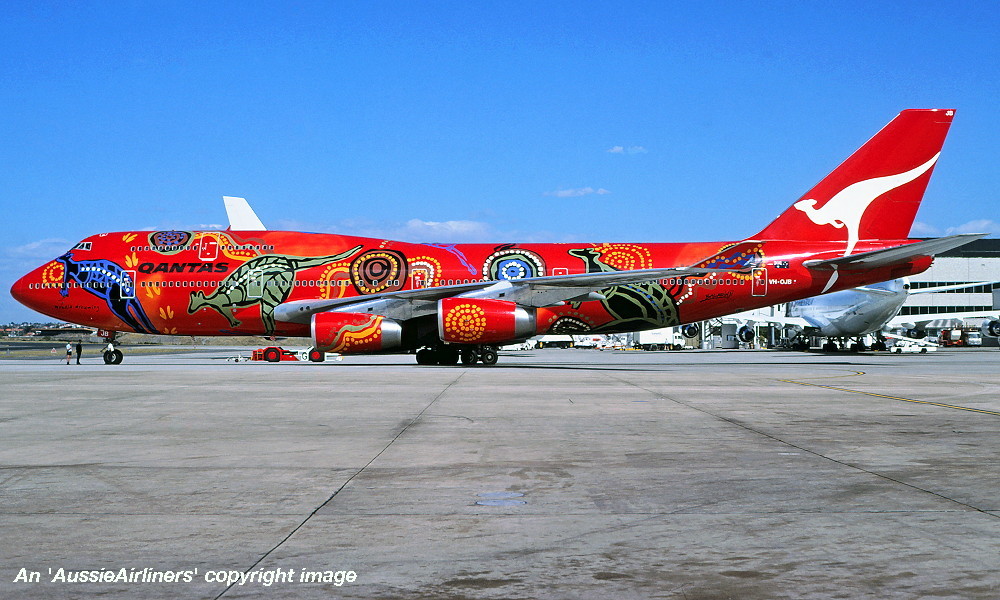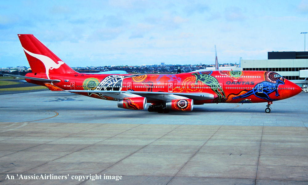 VH-OJB. Qantas The Spirit of Australia - in the 'Wunala Dreaming' livery, September 1994. (Qantas Heritage Collection Copyright Image 4630-384.) |