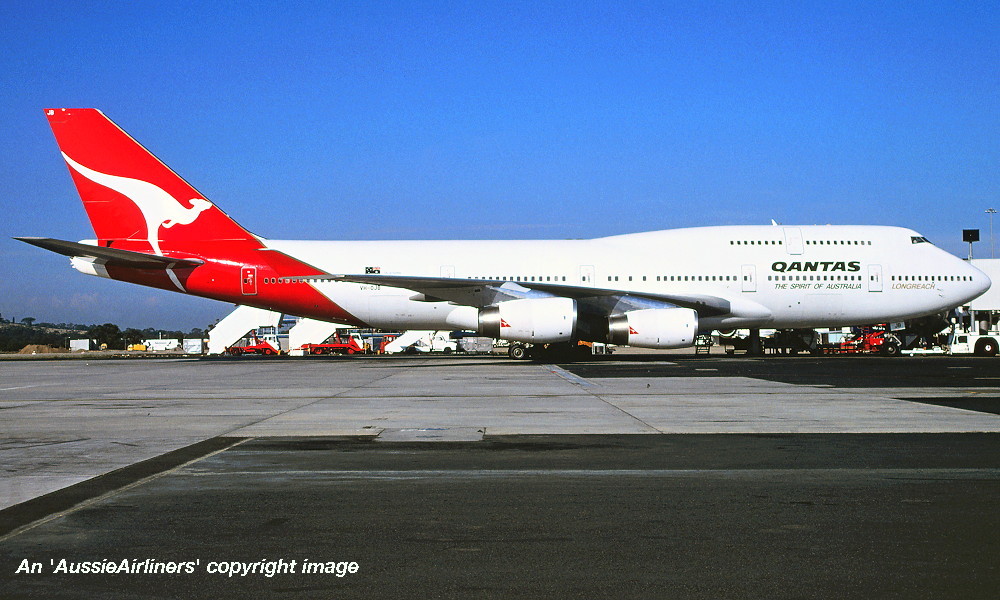 VH-OJB. Qantas The Spirit of Australia - 'City of Sydney' in the standard livery at Sydney Kingsford Smith Airport, October 02, 1989. (R. N. Smith Copyright Image 4631-533.) |