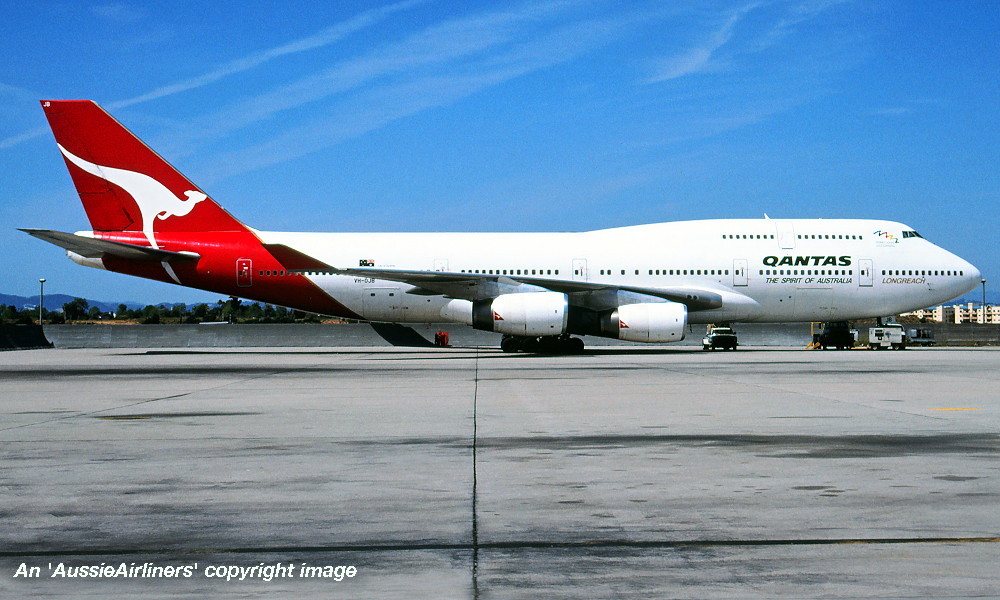 VH-OJB. Qantas The Spirit of Australia - 'City of Sydney' in the standard livery with additional 'Sydney 2000 - Gold Sponsor' titles and logo at Los Angeles Airport, June 1993. (M. Rathke Copyright Image 4631-188.) |