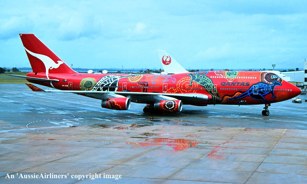 VH-OJB. Qantas The Spirit of Australia - in the 'Wunala Dreaming' livery at Sydney Kingsford Smith Airport, November 16, 1994. (R. N. Smith Copyright Image 4630-579.) |